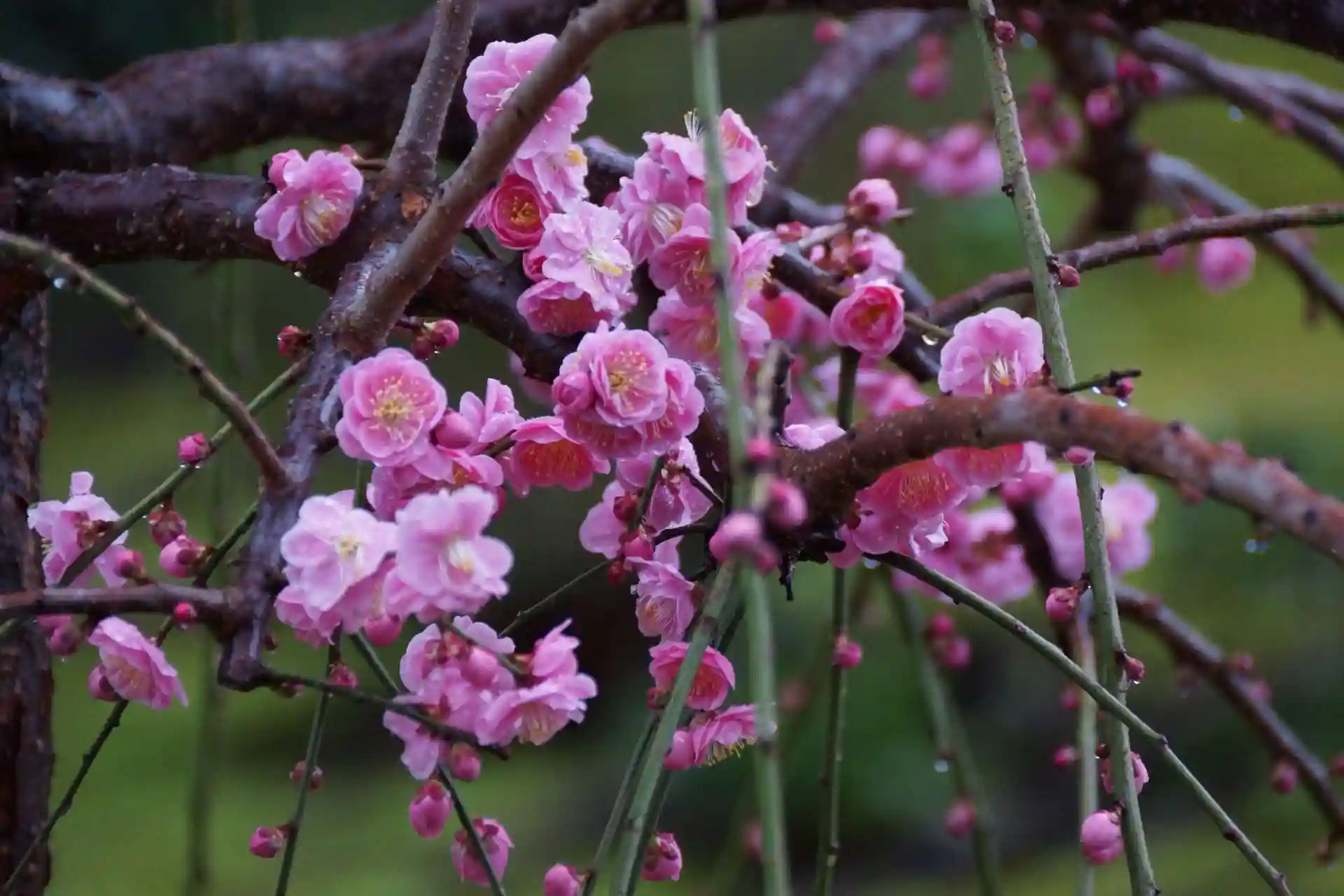 しだれ梅が中心で、白、ピンク、赤の色と緑の苔が鮮やかに調和しています。
