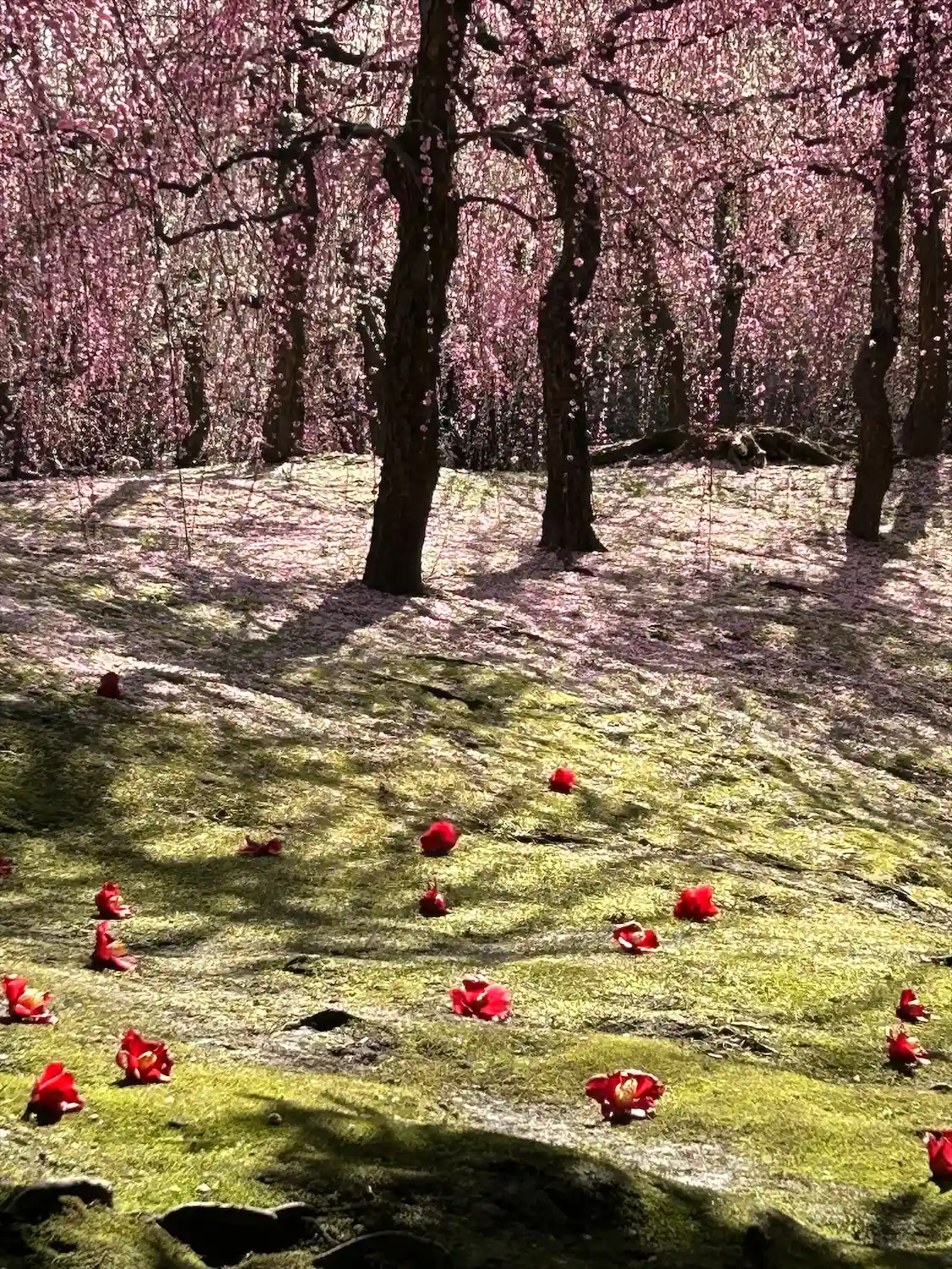 雨続きの晴れ間。枝垂れ梅は、少し雨にやられたかな。