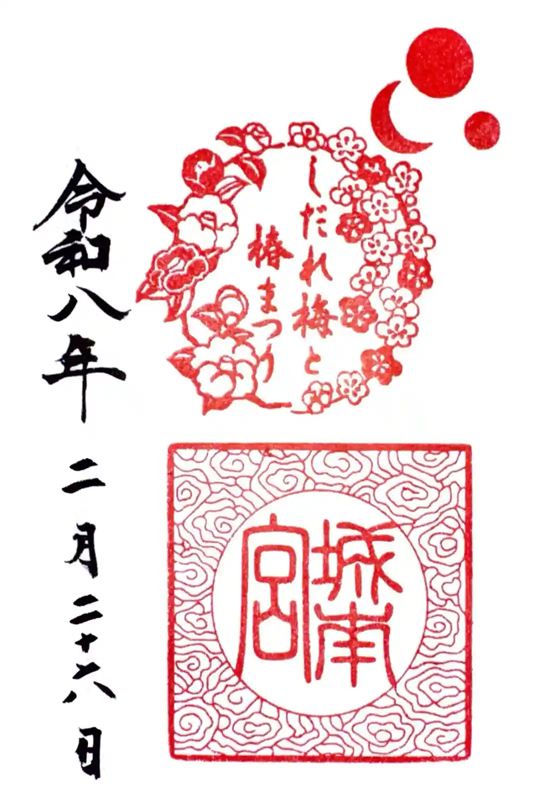 上部に三光の神紋、「しだれ梅と椿まつり」の文字が入った梅と椿の花の印、下部に城南宮の印が押されています。