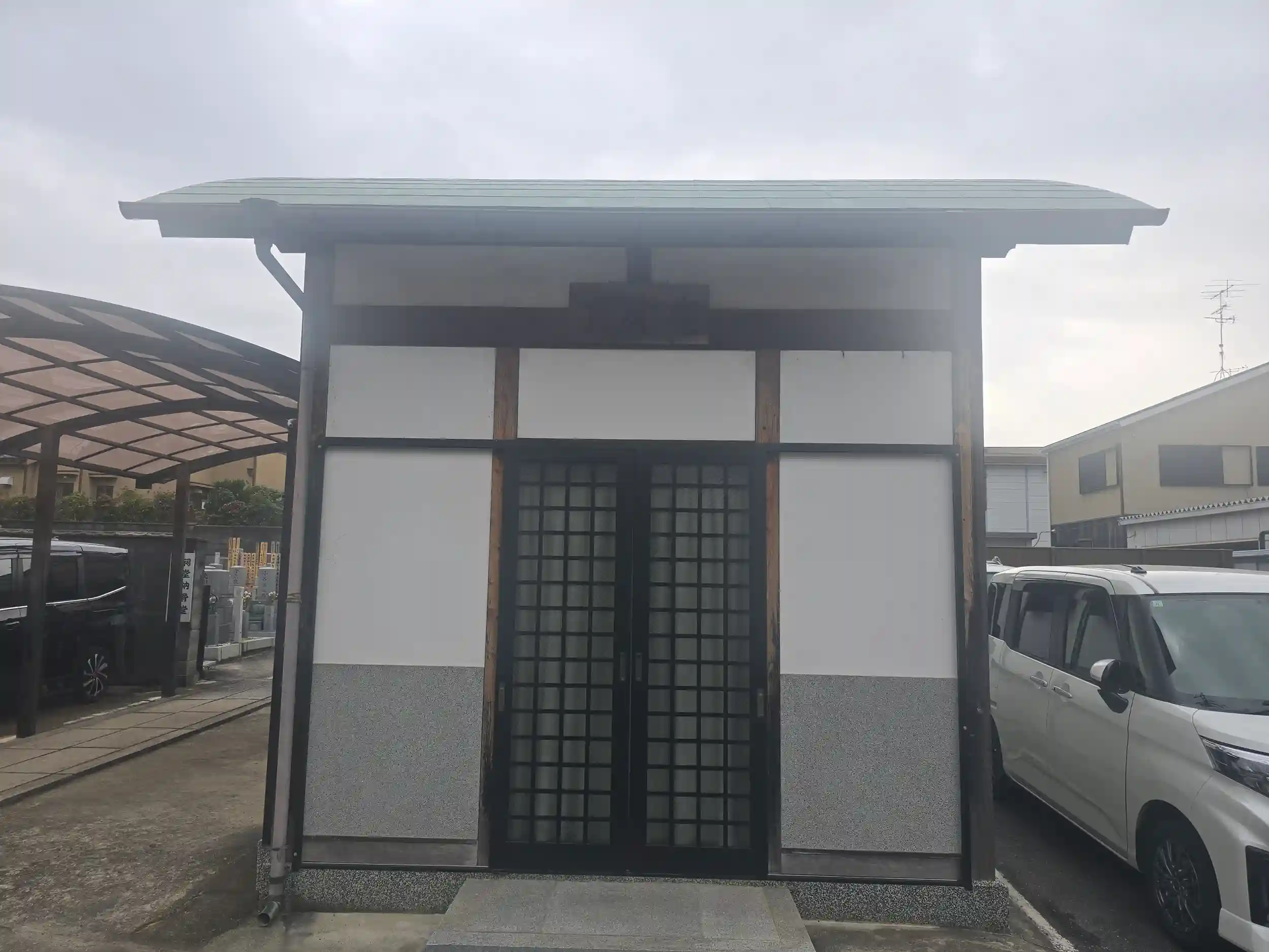 雨が降る中で閉ざされた山門の前で