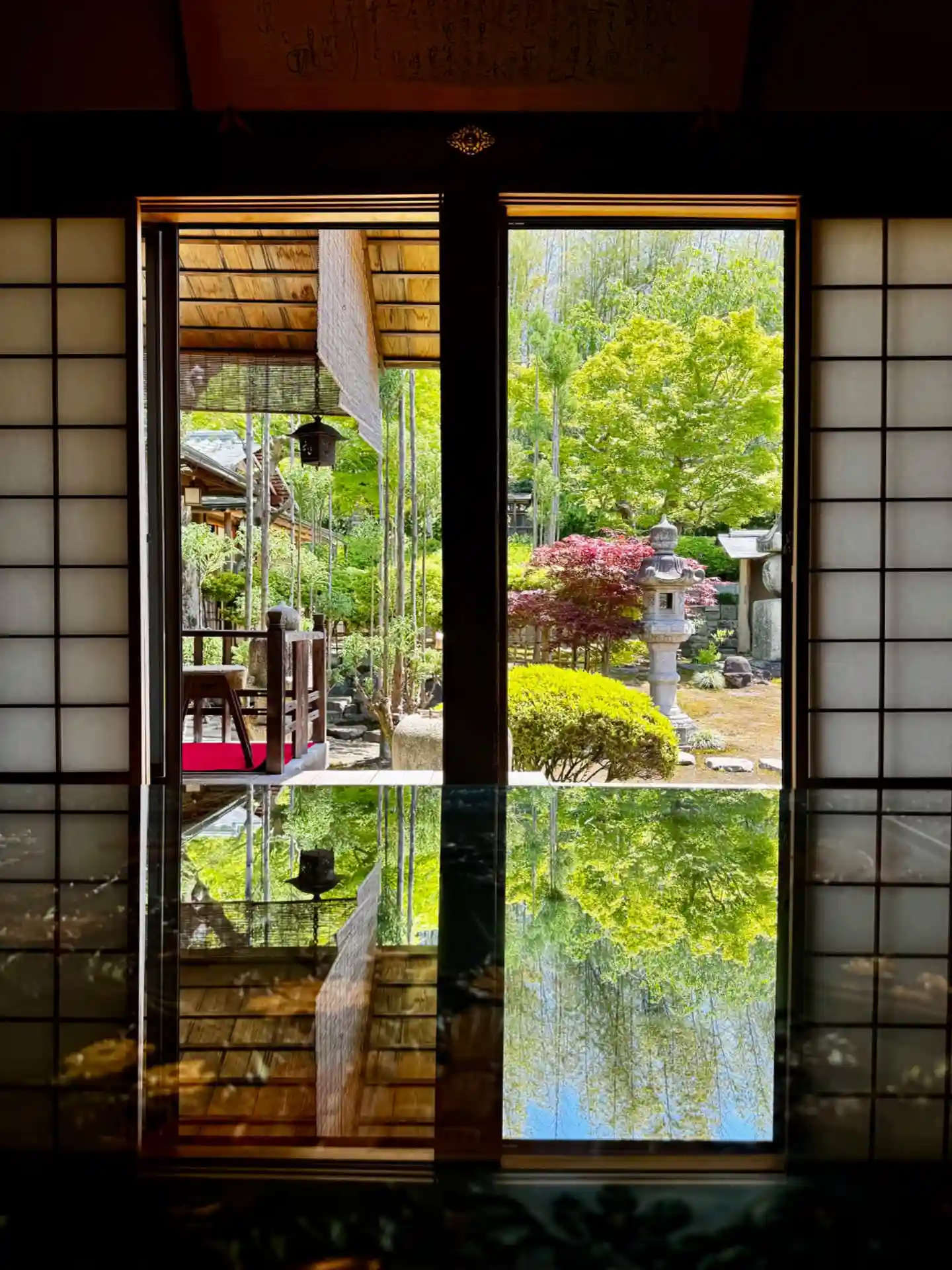 堂内には数多くの貴重な調度品があり、装飾を施した机に映るお庭が上下対称に美しく映えています。