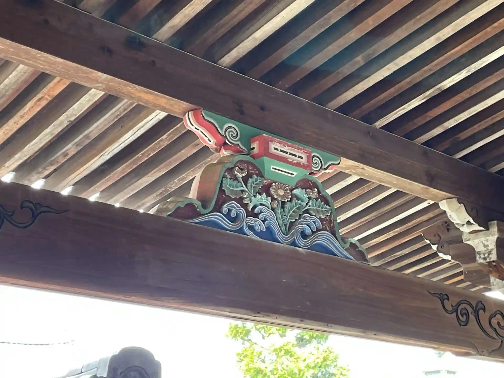 梁にカラフルな彫刻が施されています