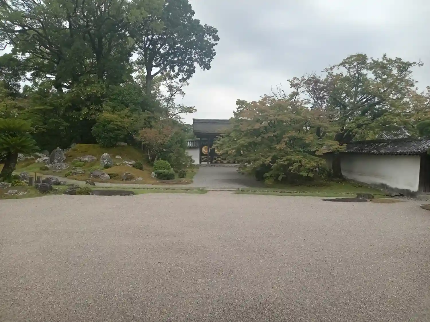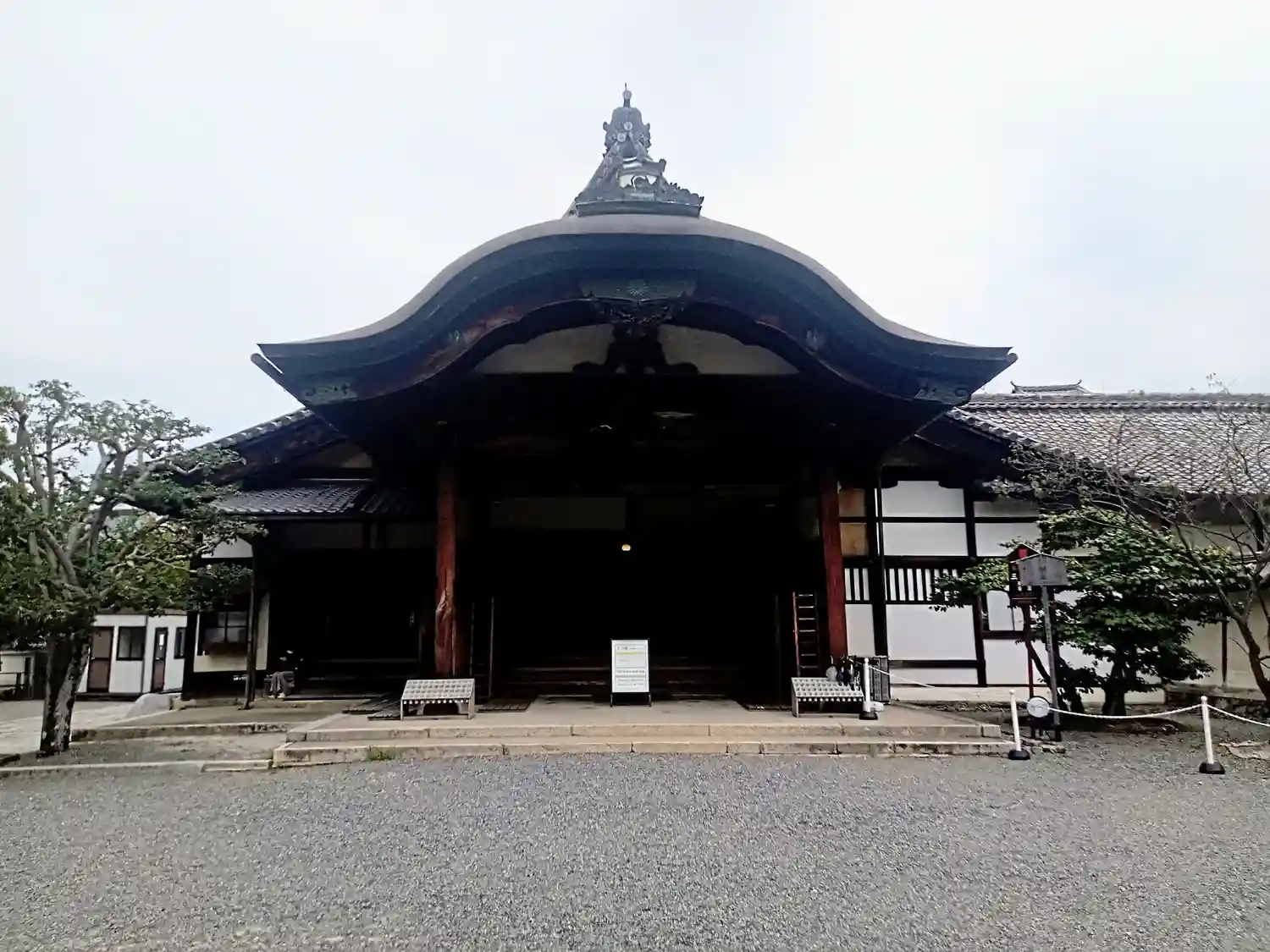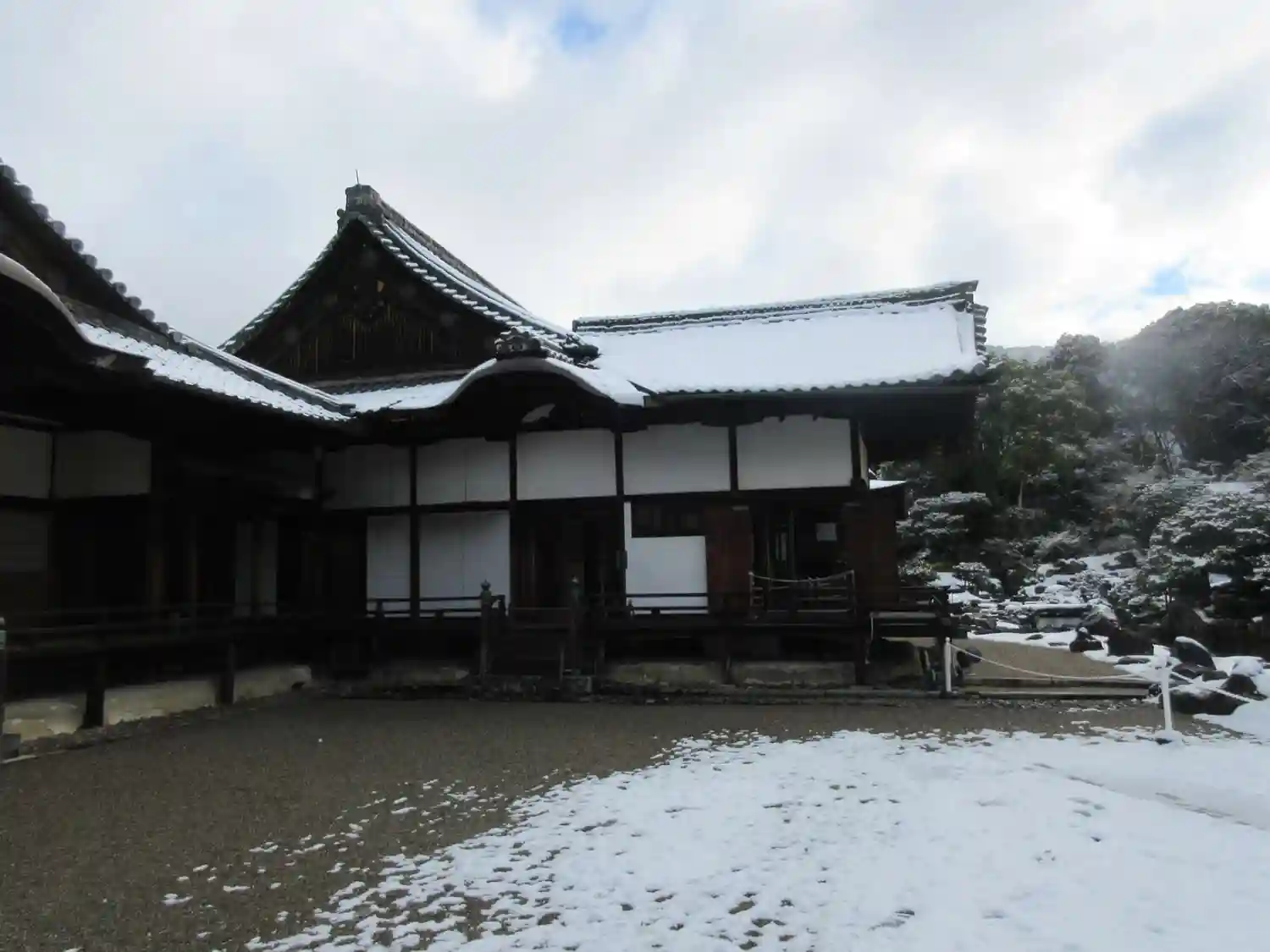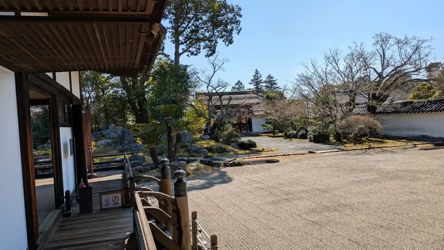 左手は<葵の間>、<秋草の間>、<勅使の間>の3つの部屋が並ぶ建物。3つの部屋は、国指定の重要文化財。右手は国宝<表書院>の側面。