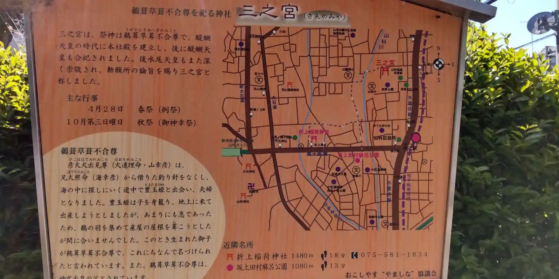 山科の三之宮です。御祭神に鵜鵜草葺不合尊、醍醐天皇、後小松天皇をお祀りされています。東野公園に隣接し緑の多い神社です!