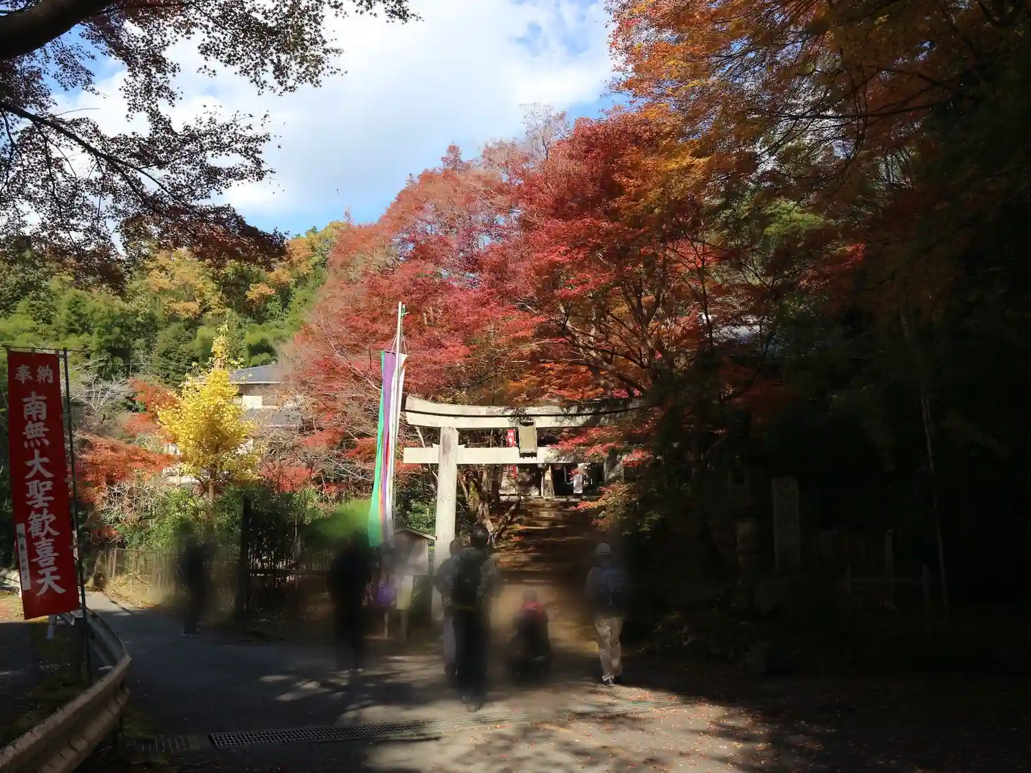 毘沙門堂のあと裏参道から入りました。なだらかな坂道5分ほど歩くと、鳥居、三門があり、山の木々に囲ま…