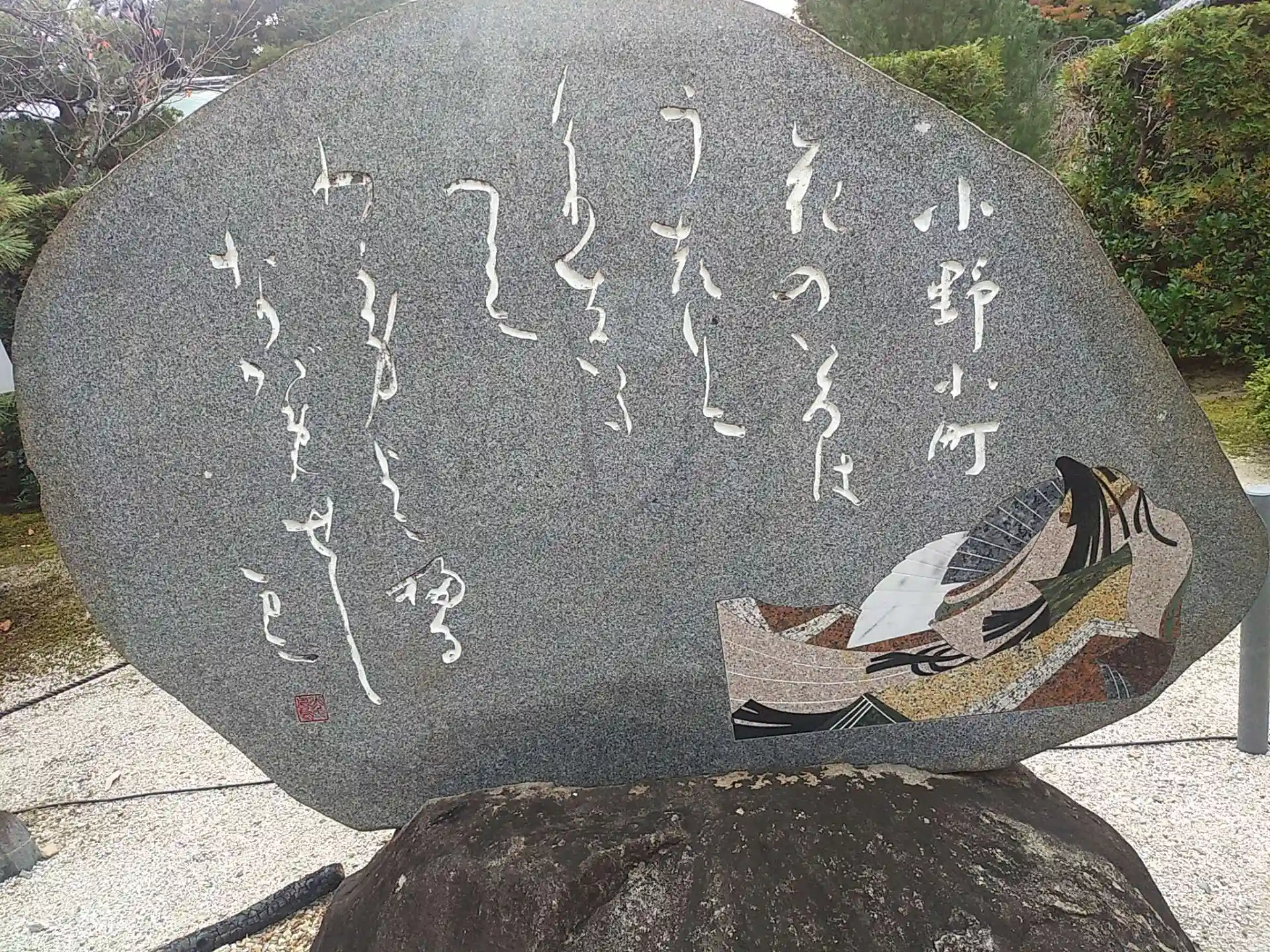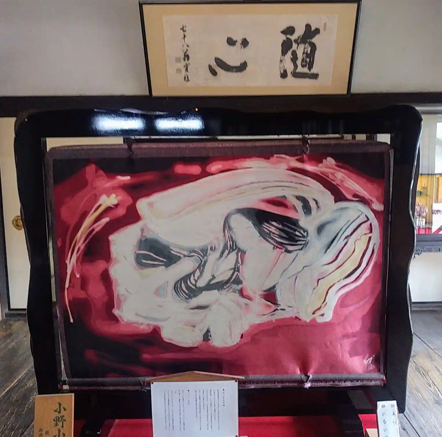 表書院「能の間」に飾られている襖絵「極彩色梅匂小町絵図」です。2009年に納められた、こちらの作品は、「生誕の図」「饗宴の図」「伝承の図」「夢幻の図」の4つから構成されており、小町の生涯を描いたものとされているそうです。
