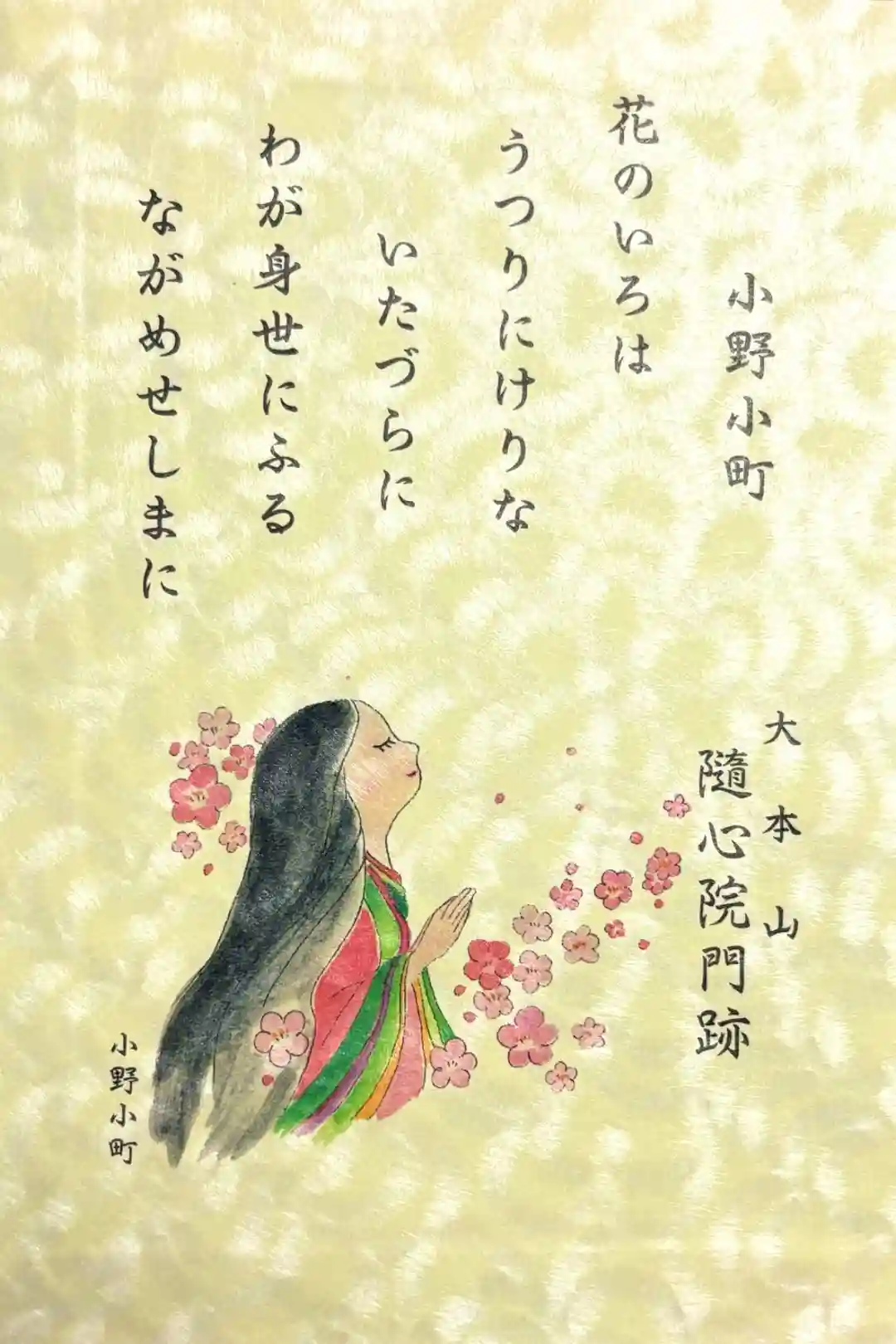 小野小町と隨心院の梅園をイメージした梅の枝をモチーフに春らしく柔らかな色使いがされた二面見開きの御朱印で、右面は真ん中に曼荼羅殿と書かれ、右上に「奉納経 小野小町遺跡」の印、右下に令和二年春季限定の文字、真ん中に蓮華座に火焔宝珠印、左下に随心院の文字、曼荼羅寺御殿随心院の印、左面は小野小町の和歌「夢路には 足もやすめず通へども うつつにひとめ見しごとはあらず」が入っています。