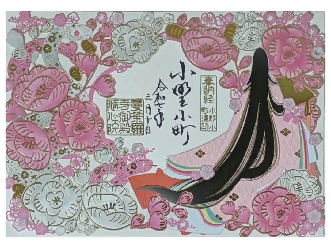 『極彩色梅匂小町絵図』にある小野小町が文張地蔵に文を張っているシーンをモチーフにした御朱印で、真ん中に文張地蔵尊と書かれ、右上に「奉納経 小野小町遺跡」の印、真ん中に梵字(地蔵菩薩)の三宝荒神宝珠印、左下に随心院の文字、曼荼羅寺御殿随心院の印が押されています。