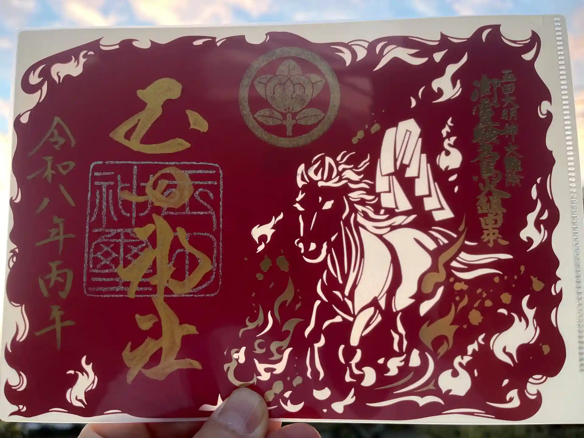 宮中の火災を鎮めた名馬火鎮の切絵御朱印です。