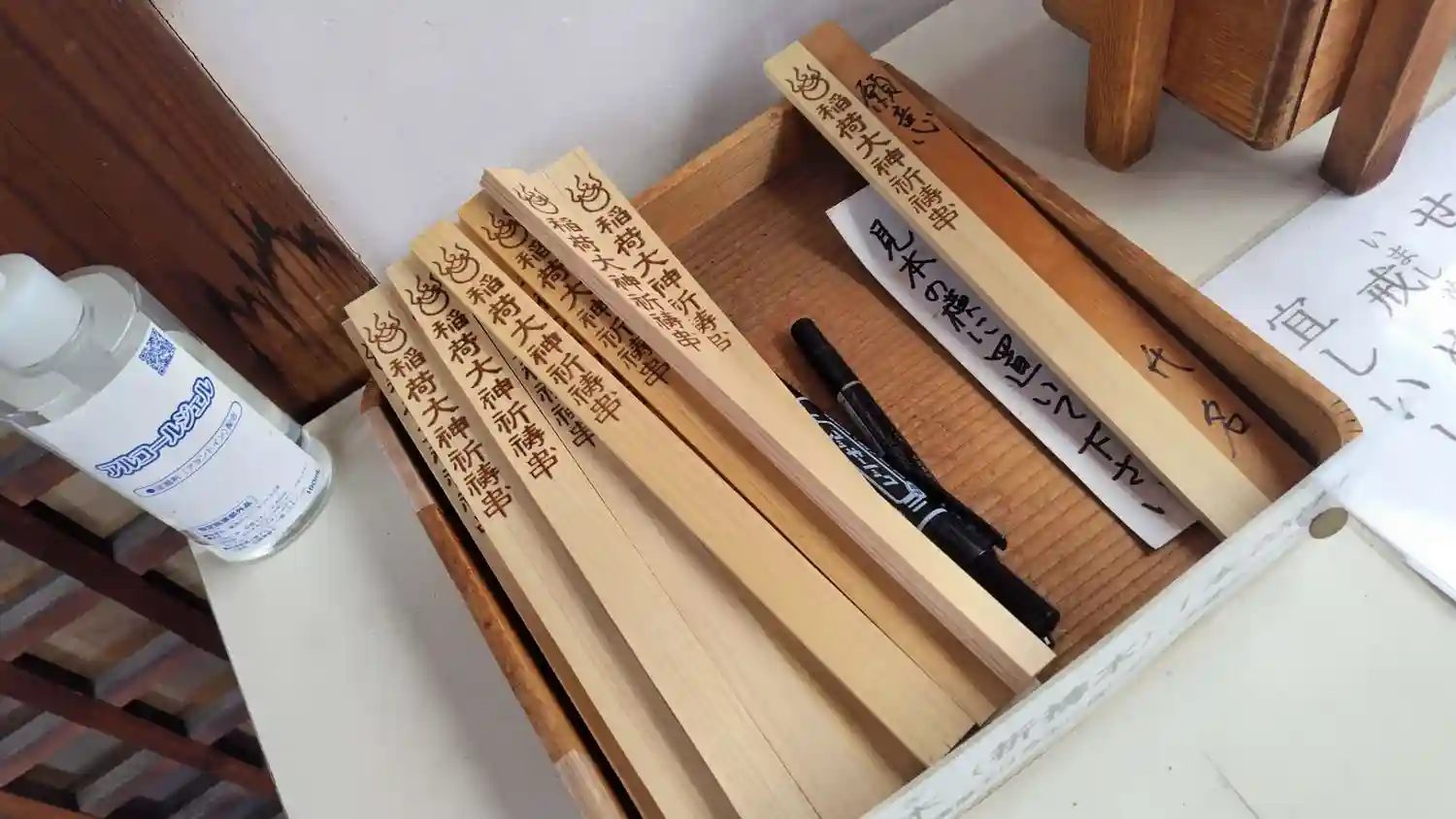 御朱印や呪符は引出しの中にあります。初穂料は賽銭箱へ。