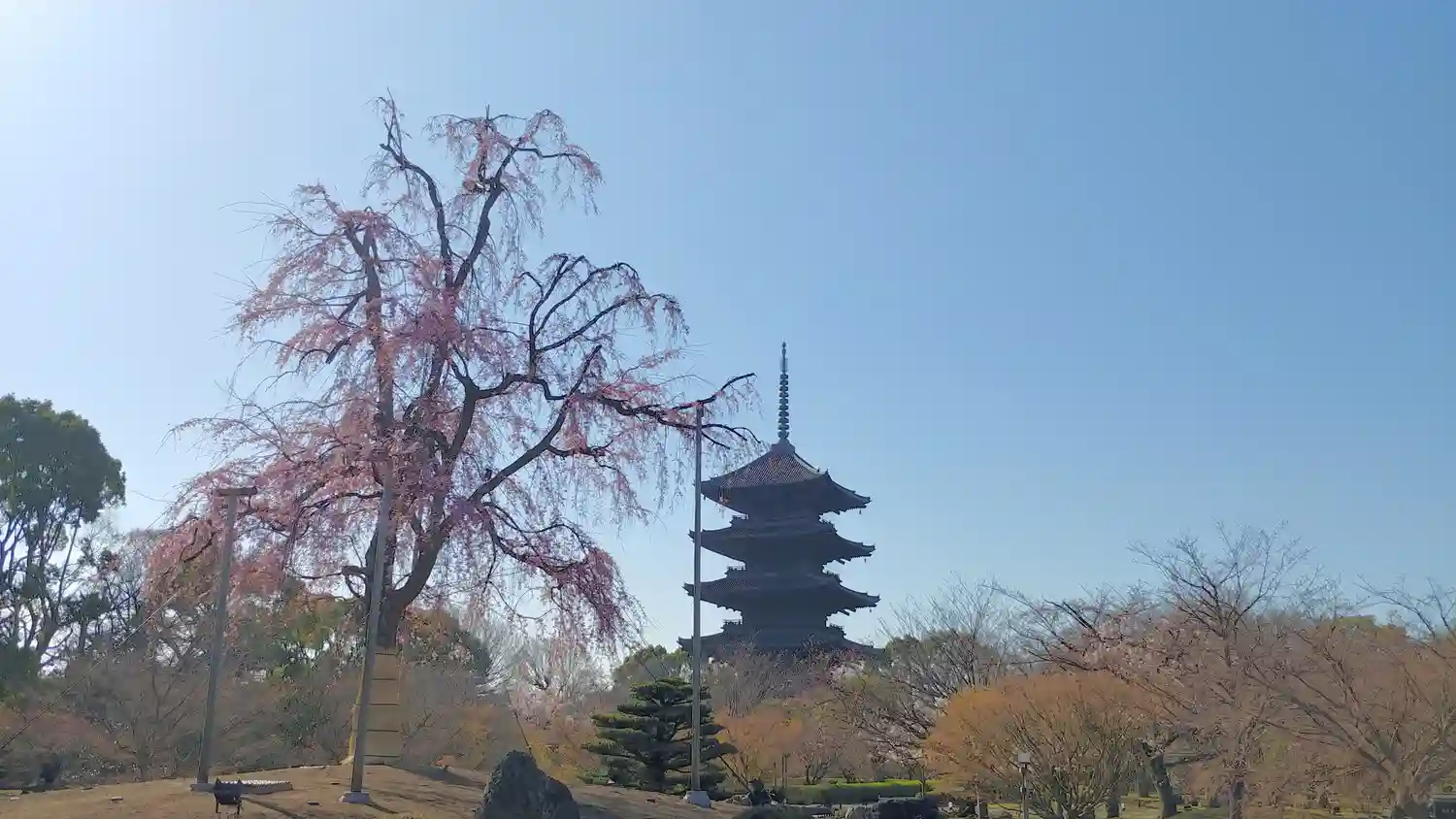 きょうの東寺。春そぞろ。庭園の桜と御影堂の桜。
