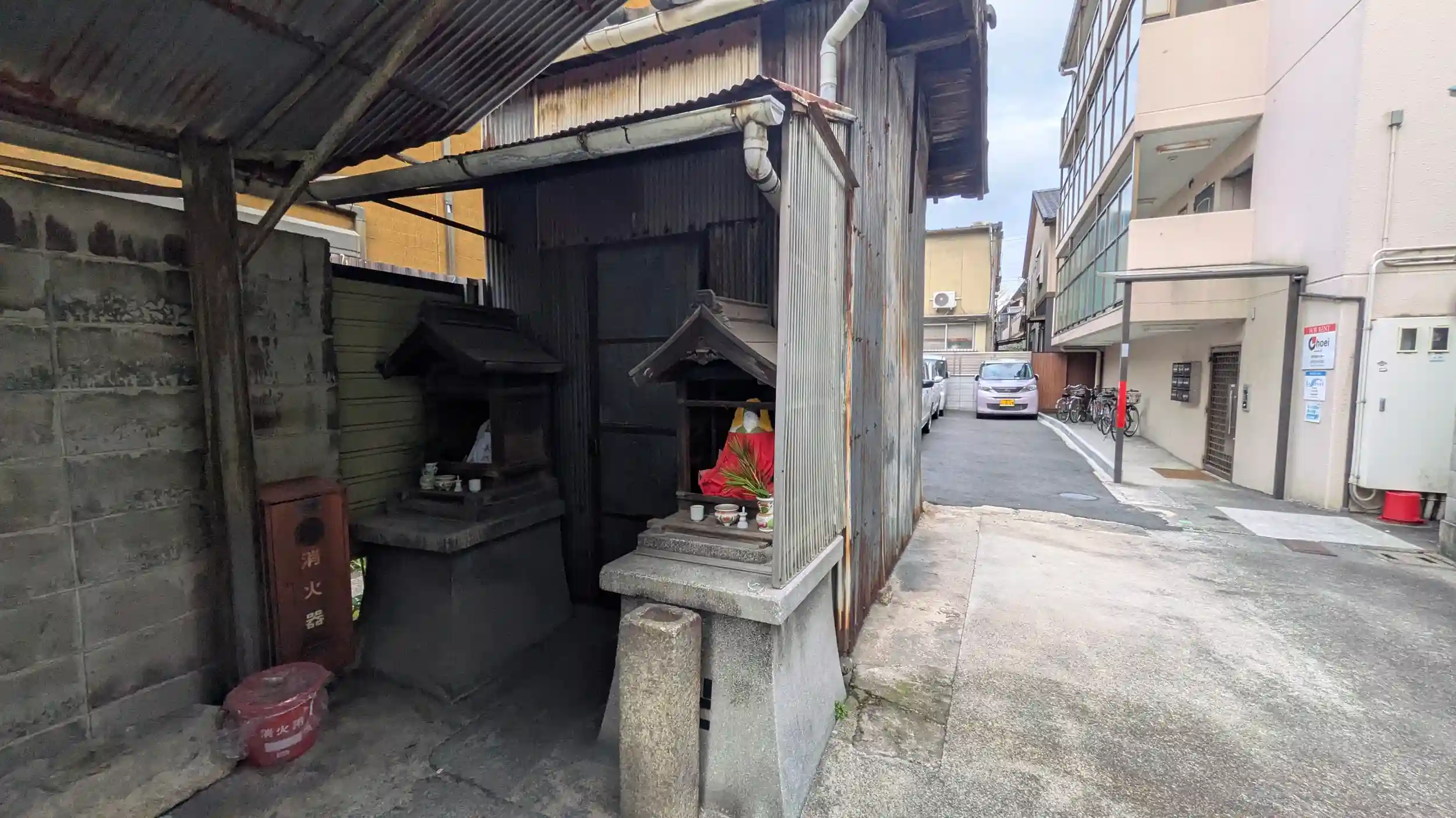 GoogleMapに掲載されている神社。まず何をもって神社なのかはわからずです😅鳥居もなく地蔵様が二体と途端に囲まれた建物のみで周りは駐車場になっていました。