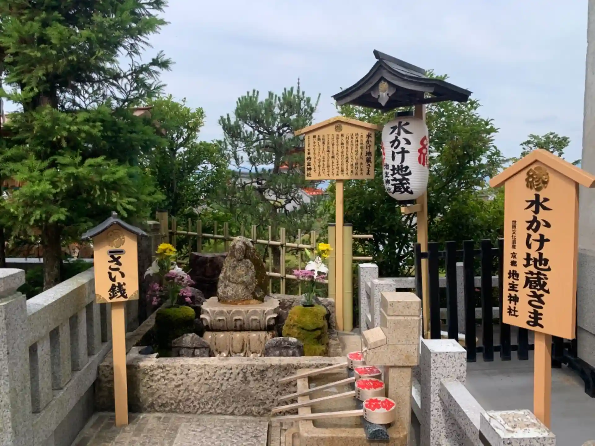 地蔵のすぐそばには、水の溜まった容器と水をすくうための柄杓(ひしゃく:大きなスプーンのような道具)があります。そこで水をすくい、地蔵の体にやさしくかけます。流れ落ちる水とともに、参拝者の悩みも落ち、心が清められるのだとか。