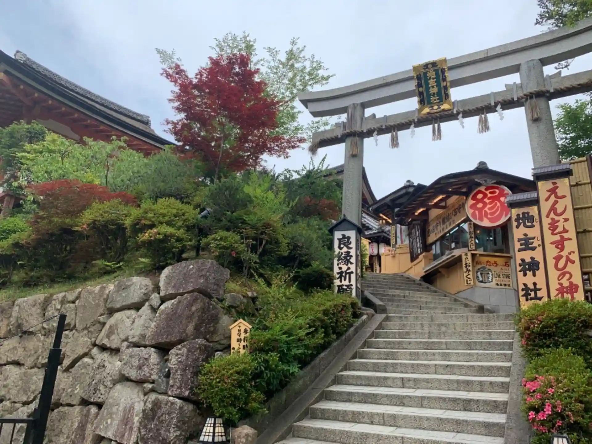 清水寺の境内にある地主神社は、大国主命(おおくにぬしのみこと)を主祭神とする縁結びの神社。創建期は不詳で神代(日本の建国以前)とされ、京都でも最古の歴史を持つ。世界遺産にも登録されている極彩色の華麗な本殿は1633(寛永10)年に徳川家光が再建したもので、入母屋造と権現造を折衷し、双堂という奈良時代の様式を今に伝えている。境内には“恋占いの石”や“しあわせのドラ”など11もの良縁祈願スポットが点在する。