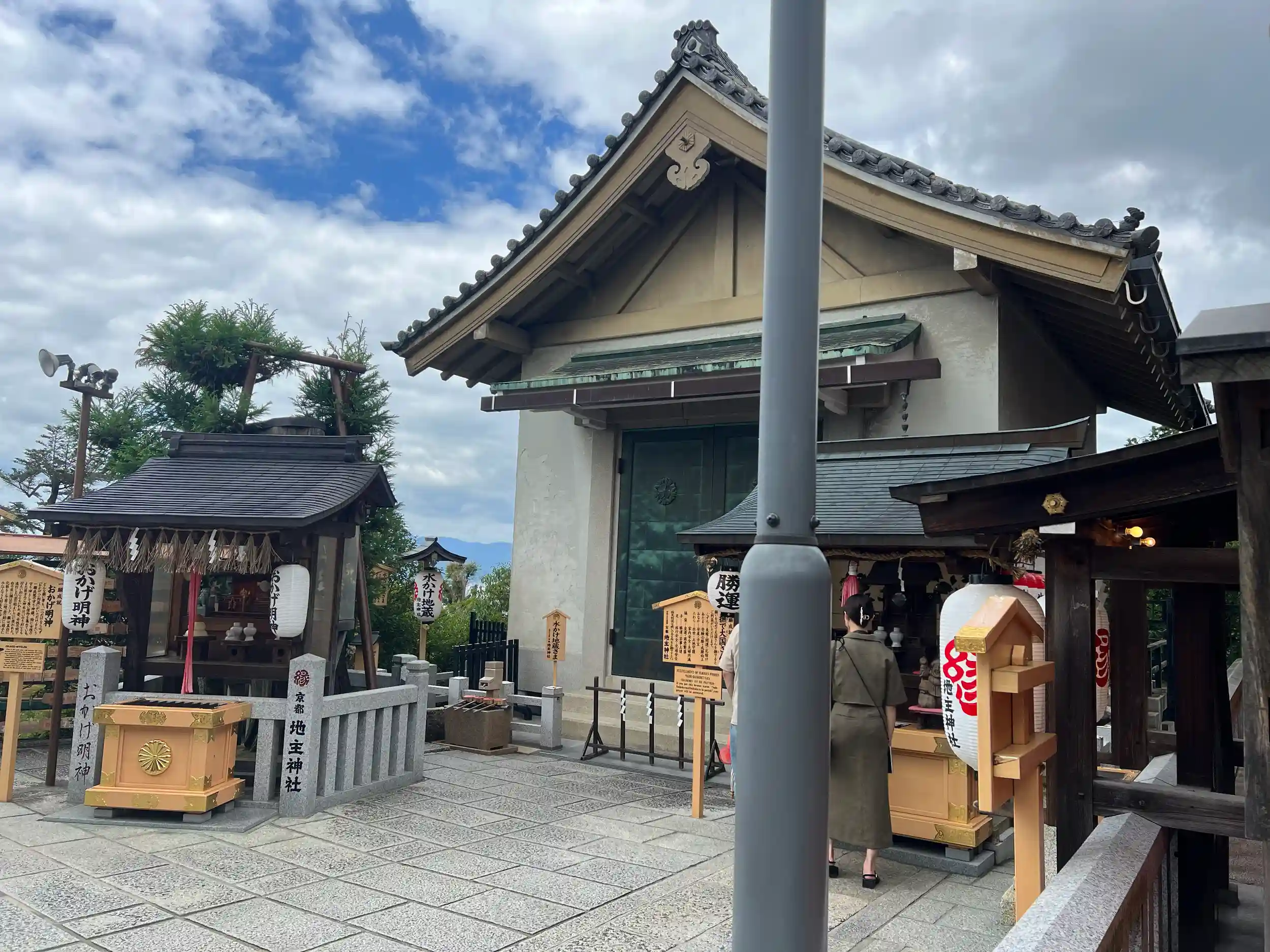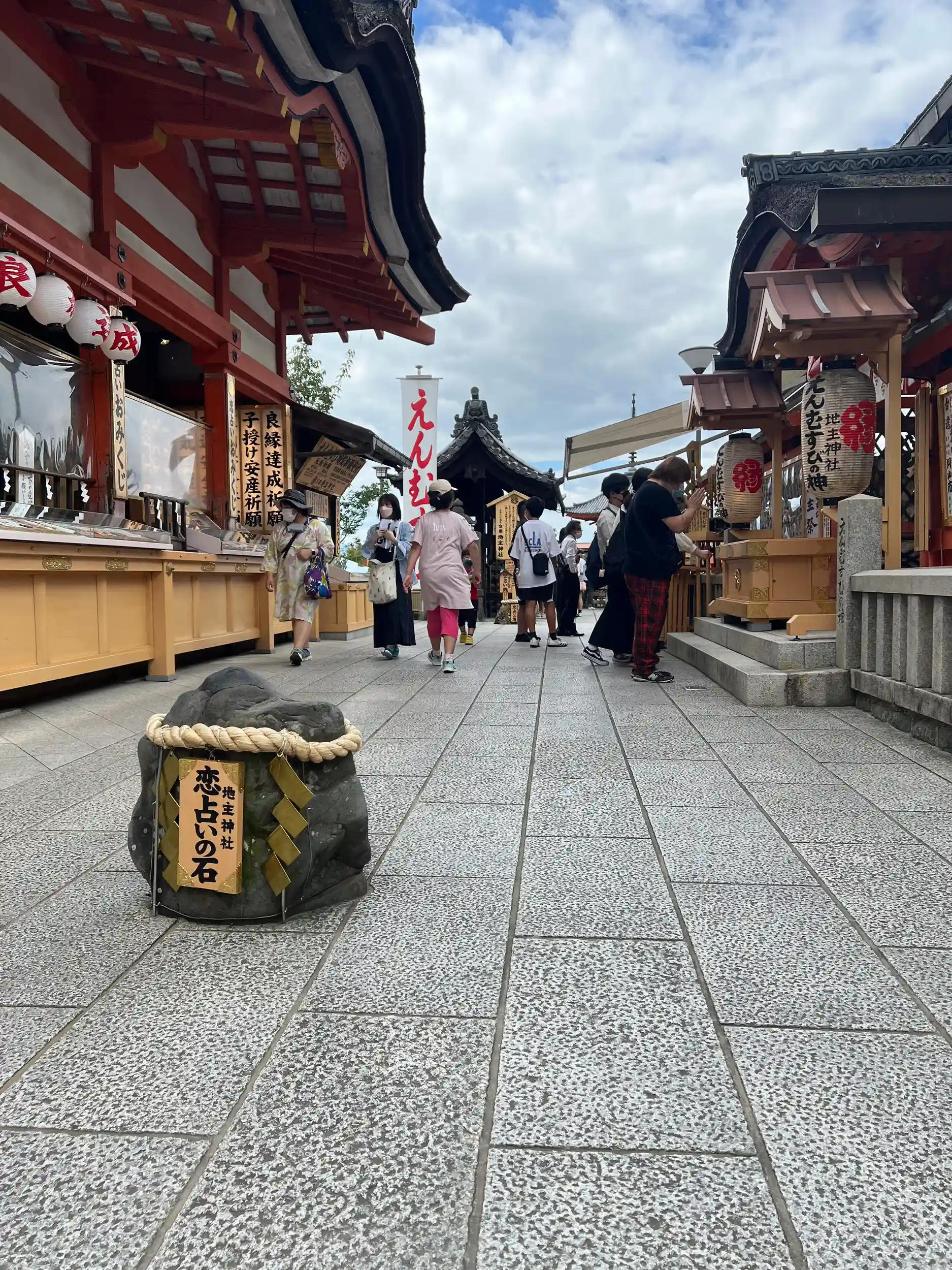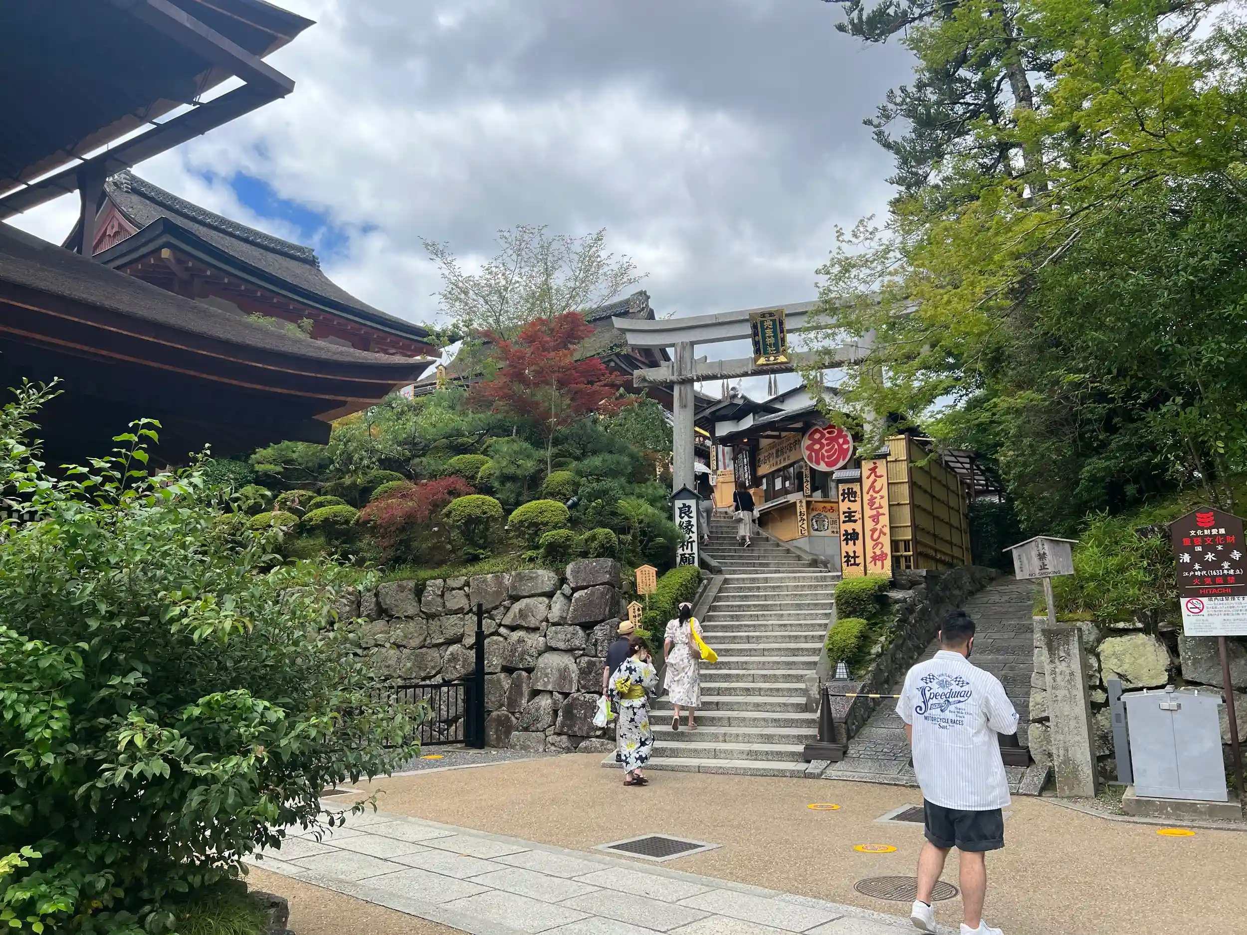 清水寺本堂の北側に位置し、えんむすびの神様で知られる神社。創建期は不明で、京都でも最古の歴史があると伝わる。本殿は寛永10年(1633)に徳川家光が再建したもので、拝殿・総門・境内地と合わせて国の重要文化財。境内にある対になった「恋占いの石」は、目をとじたまま石から石へと歩くことができれば恋が叶うといわれている。