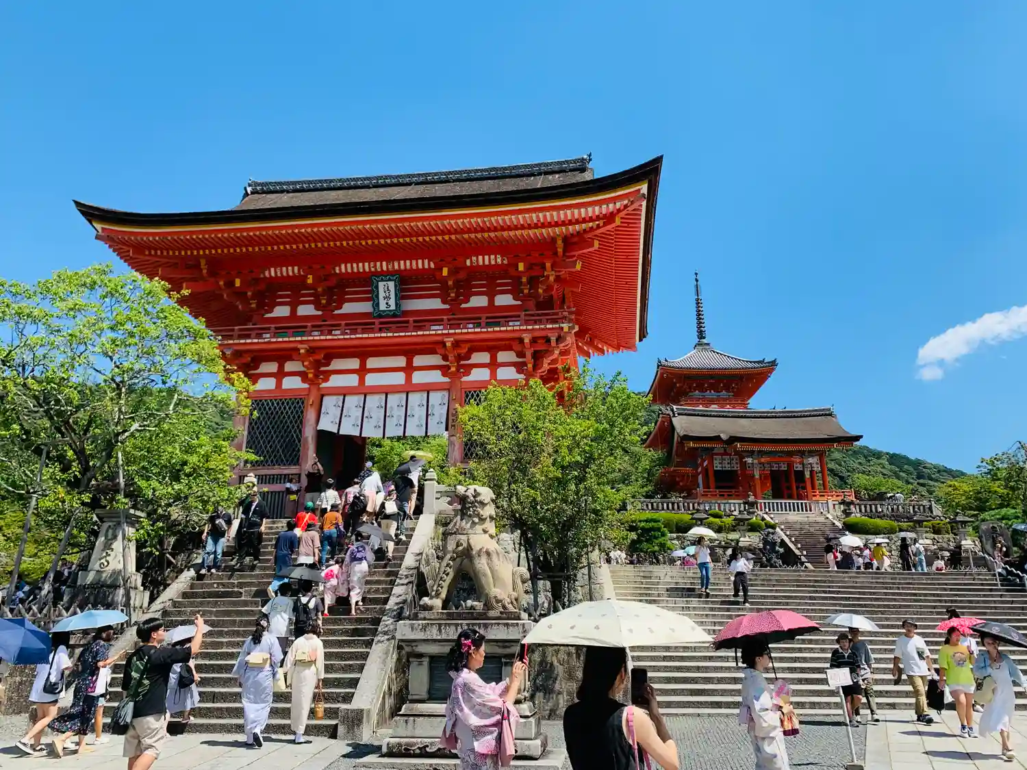 清水寺の仁王門、西門の後方に三重塔がそびえています。朱鮮やか塔が青空に美しく映えています。高さ約31メートルで国内最大級の三重塔で広大な清水寺の境内の中で一際目立つ建物です。