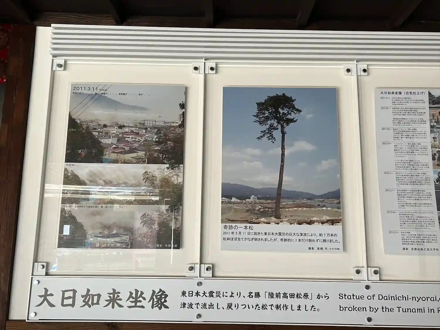 東日本大震災の津波で陸前高田から流れ着いた松の木で作られた大日如来像