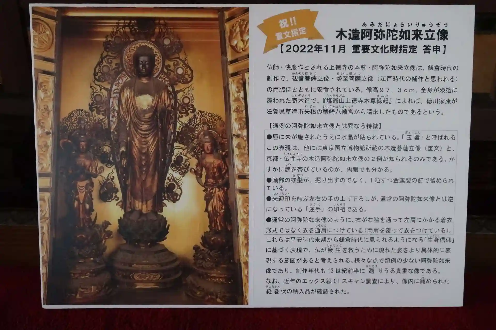 本堂、書院に入らず世継地蔵に堂外から手を合わせるだけなら拝観料は不要ですが、堂内で拝観したい私は拝観料(800円)を納めて先ず本堂へ。簡単な説明があって下陣内を自由拝観、と言っても本尊・阿弥陀如来立像が拝観出来ないと知ってがっくり。正直、これが観たくて来たのですから。(多分、本尊拝観可とはなっていなかったと思います。私の早とちりかと。)現在、国へ重文への答申中で、戻って来ていないので仕方無いと言えば仕方無い。(通常非公開。重文指定記念公開があるかも?希望的観測ですけど。)