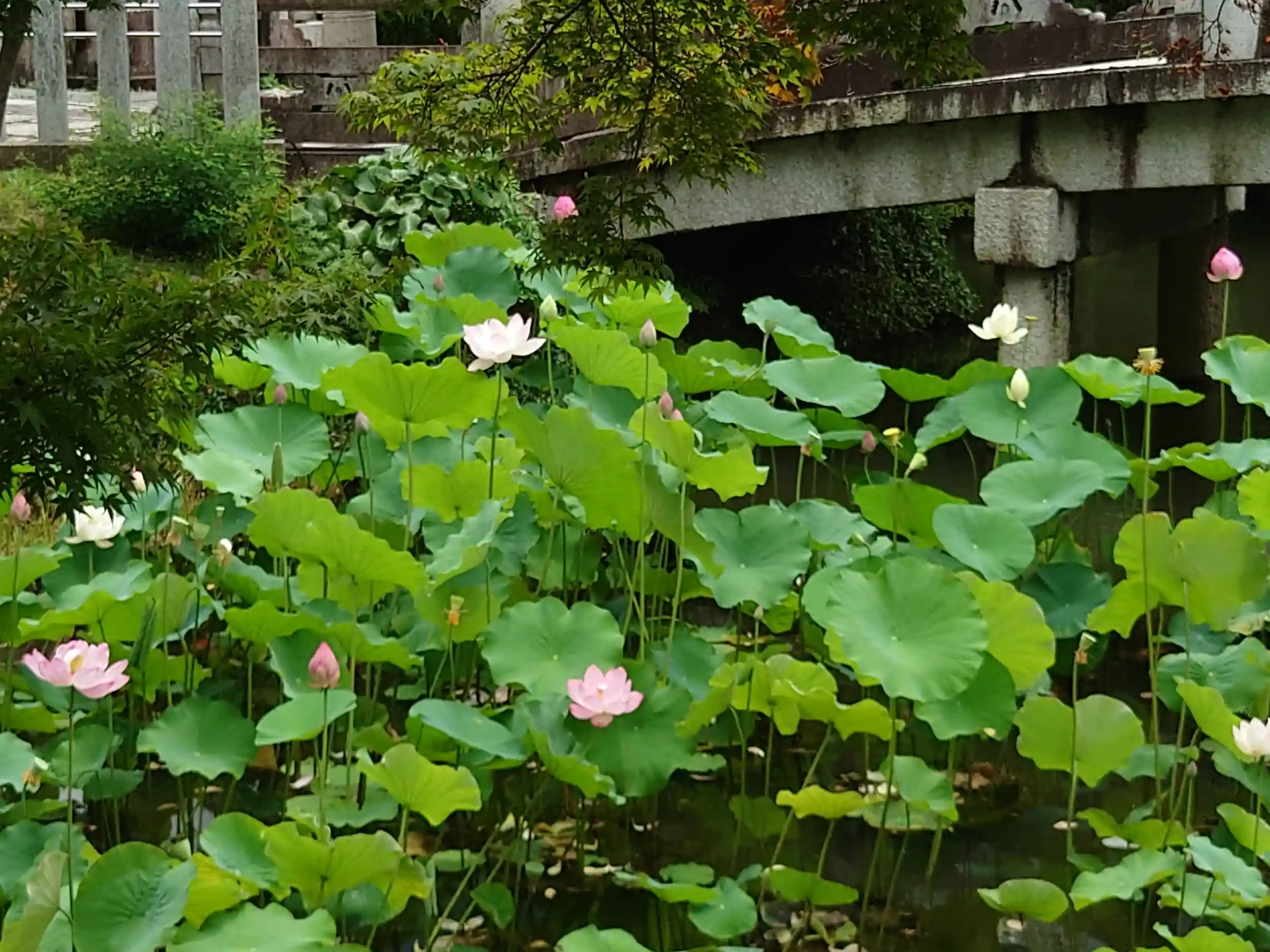 橋の下の池には蓮の花がちらほら咲いていました。