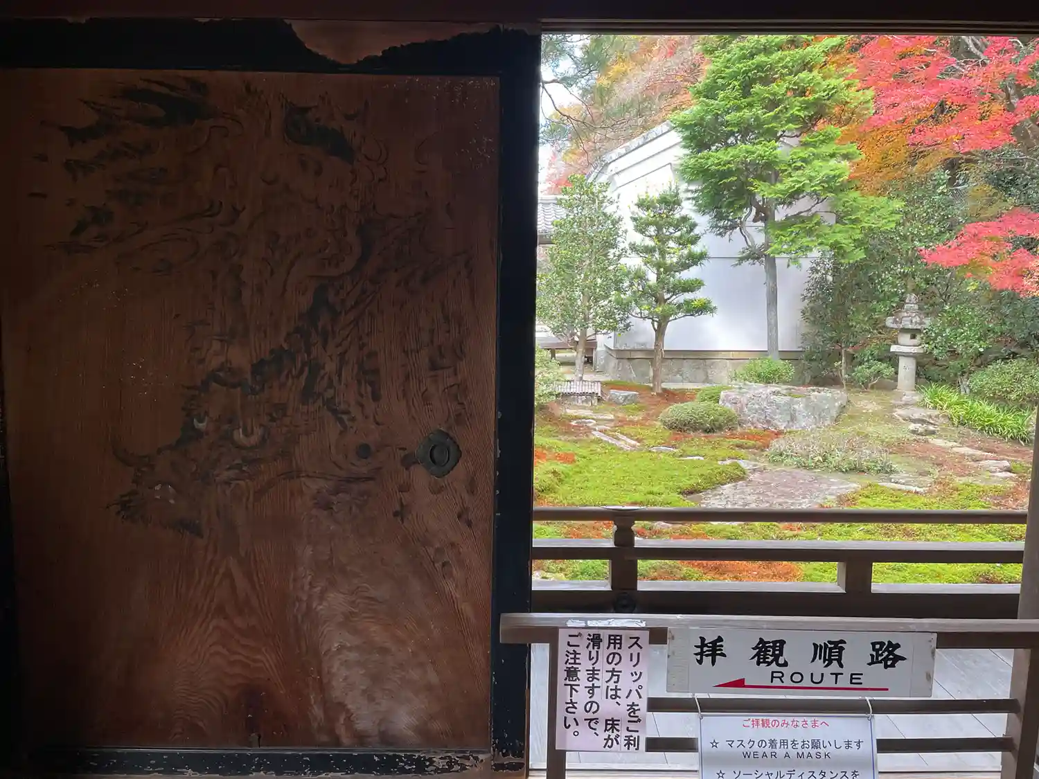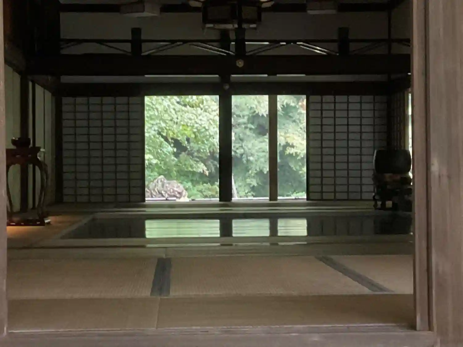 障子の欄間から見える紅葉。晩秋の色づく頃には床が赤く染まります。