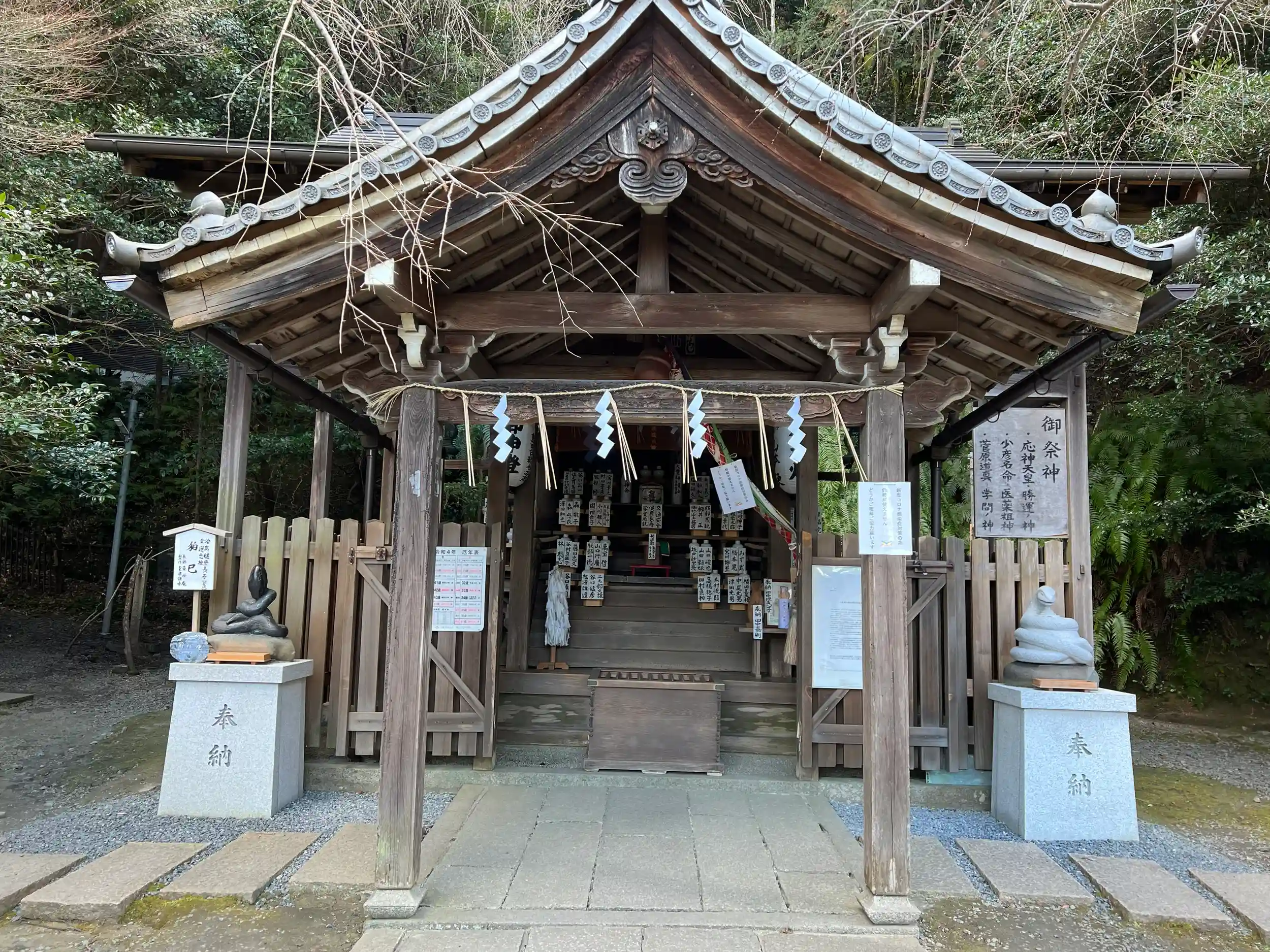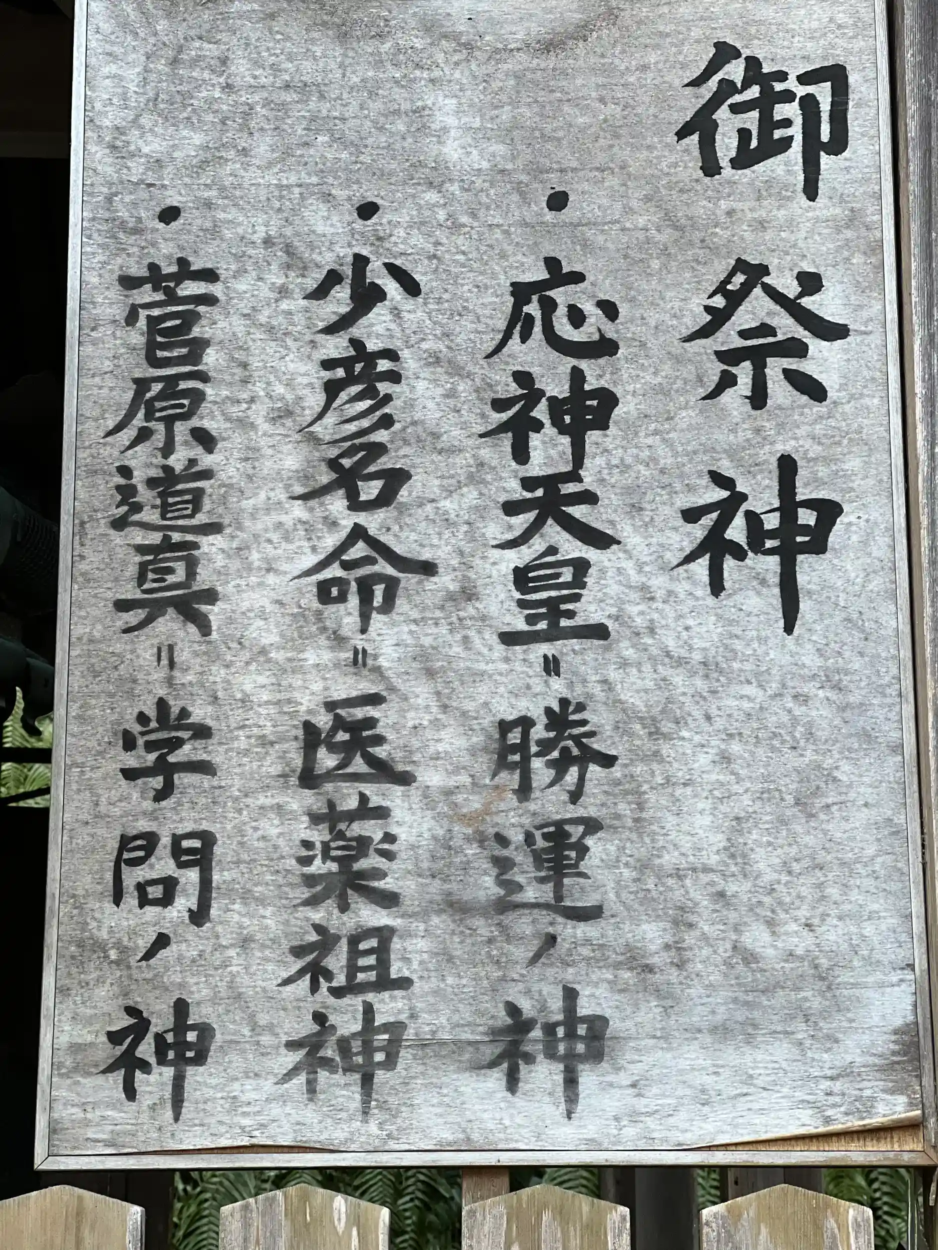 創建当初は椿ヶ峰に鎮座し、少彦名命を祀った神社だったが、寛仁年間(1017~21)に現在地へ移された後、応神天皇と菅原道真が合祀された。