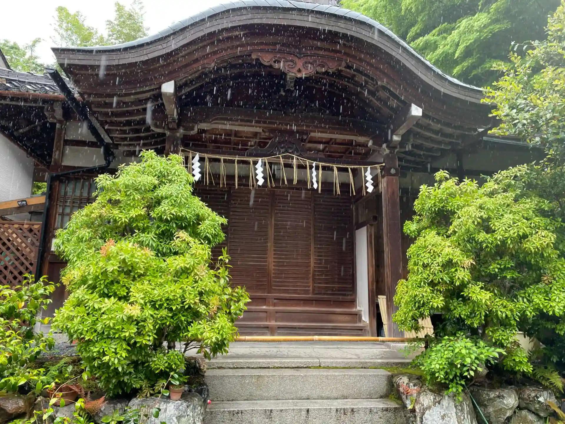 拝殿 外国の方が雨宿り
