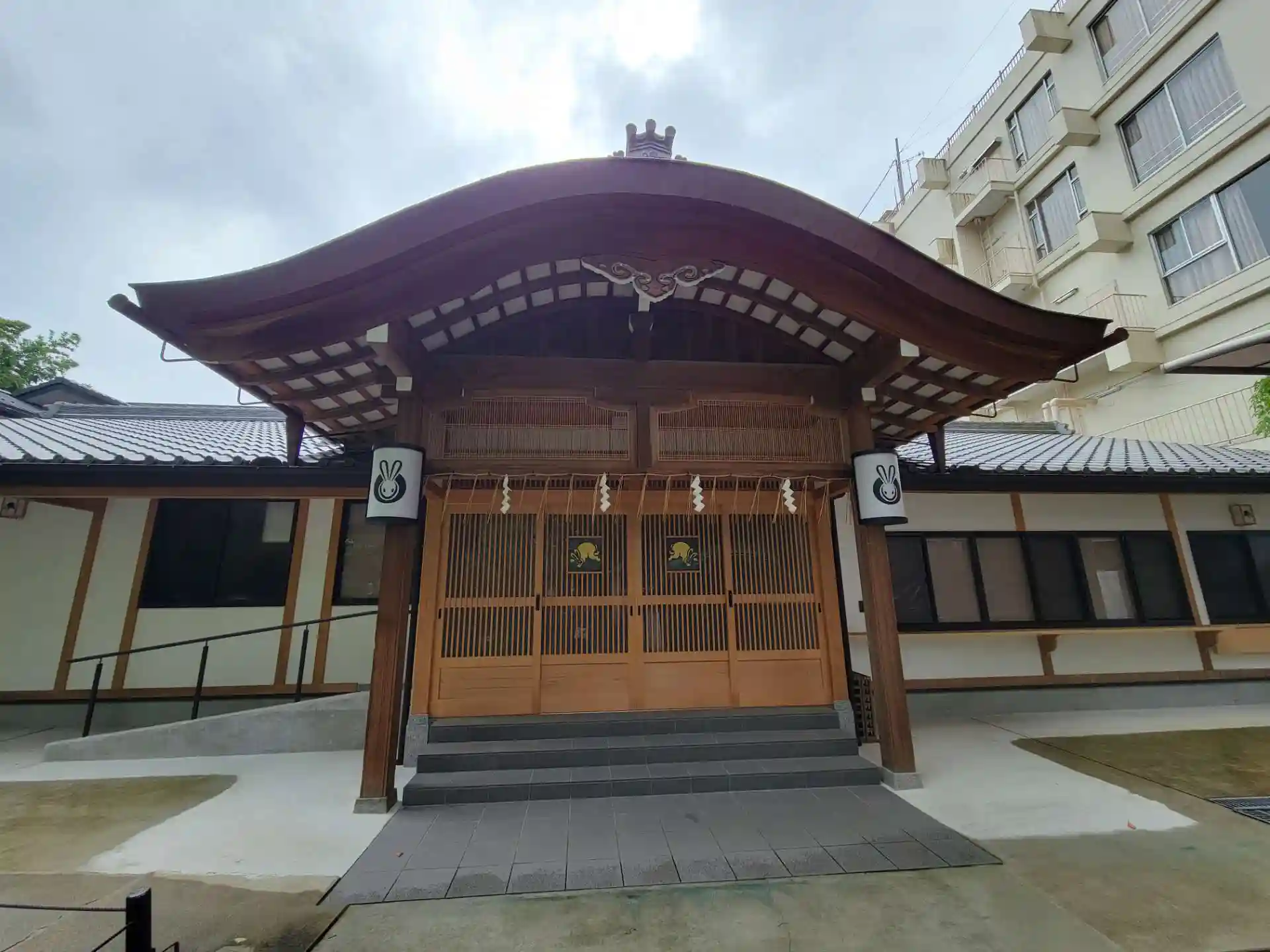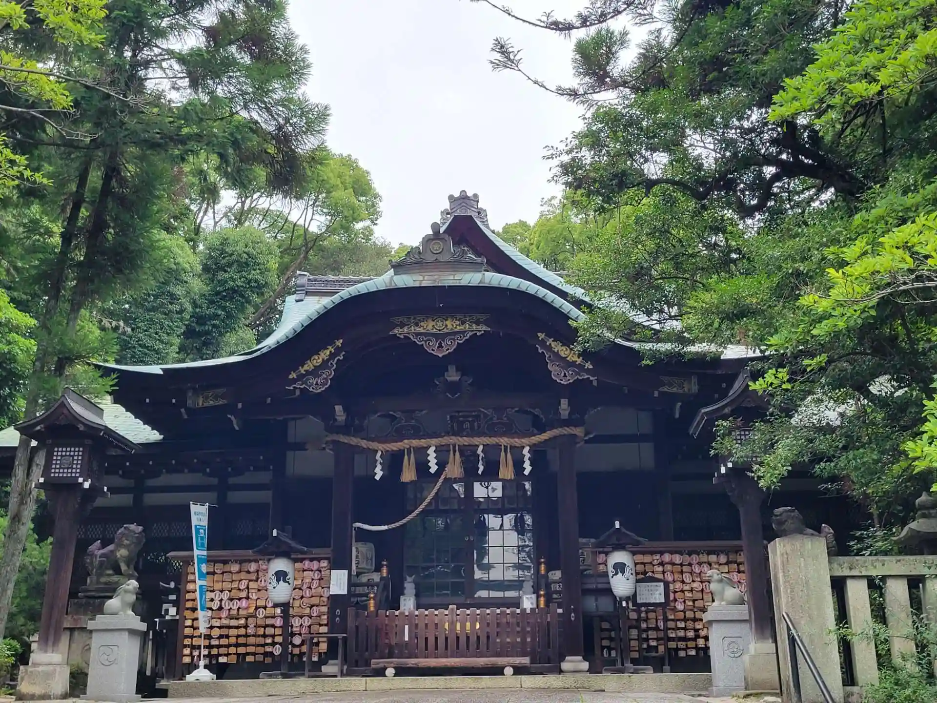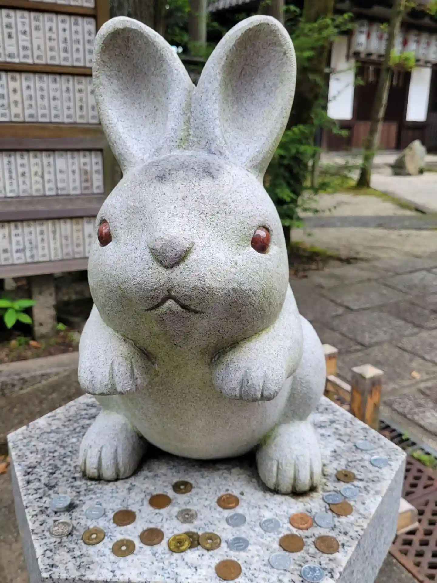 ウサギがいっぱいで、かわいらしい感じですが、拝殿も緑とあいまって、素敵です。