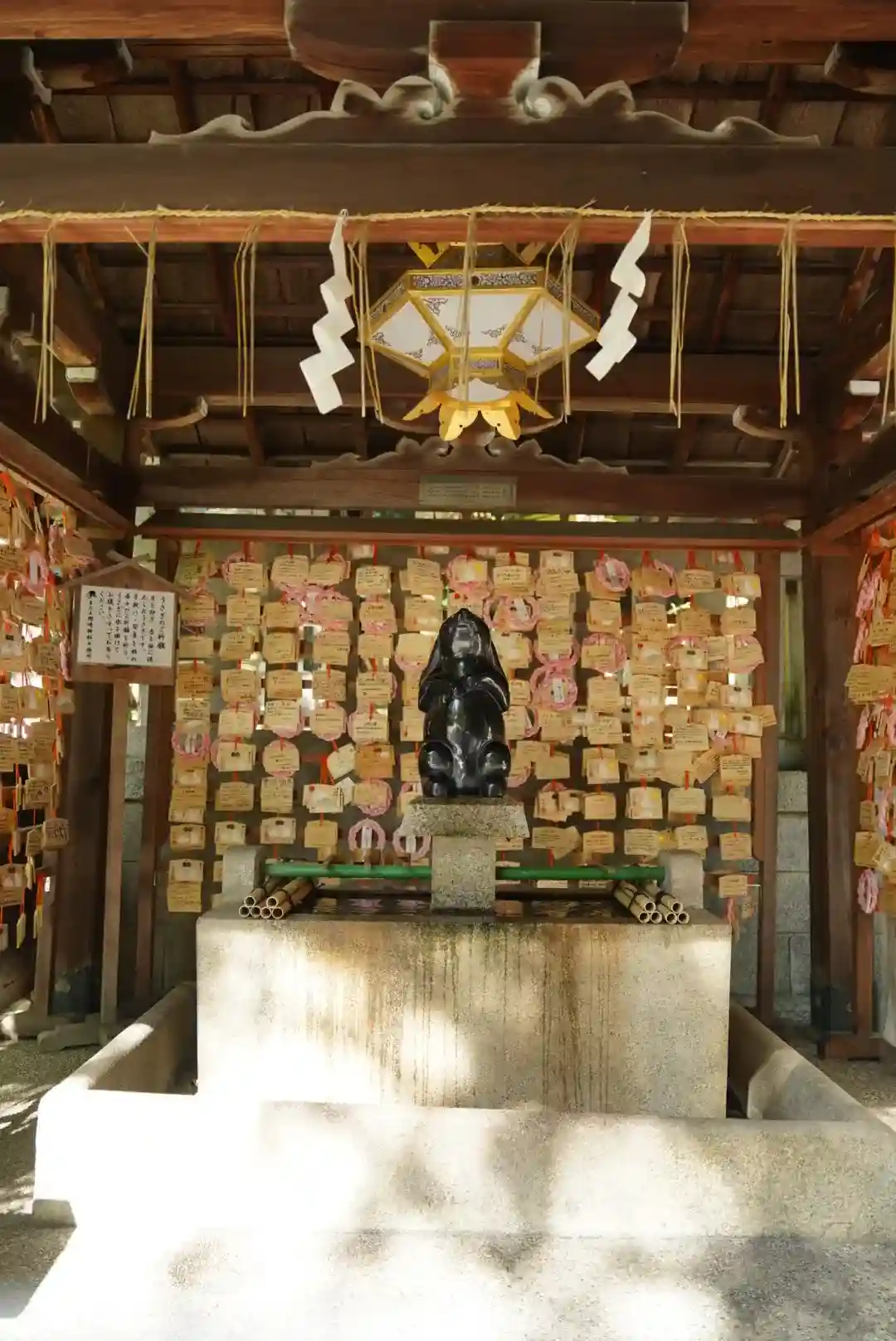 安産・子授けの神様として知られる岡崎神社には、境内のいたるところにうさぎがいます。今回は特別な願いがあったわけではないですが、可愛いうさぎたちを見ているだけでとても癒されました。特に黒うさぎの手水舎や、赤い柵に並べられた小さなうさぎのお守りが印象的でした。