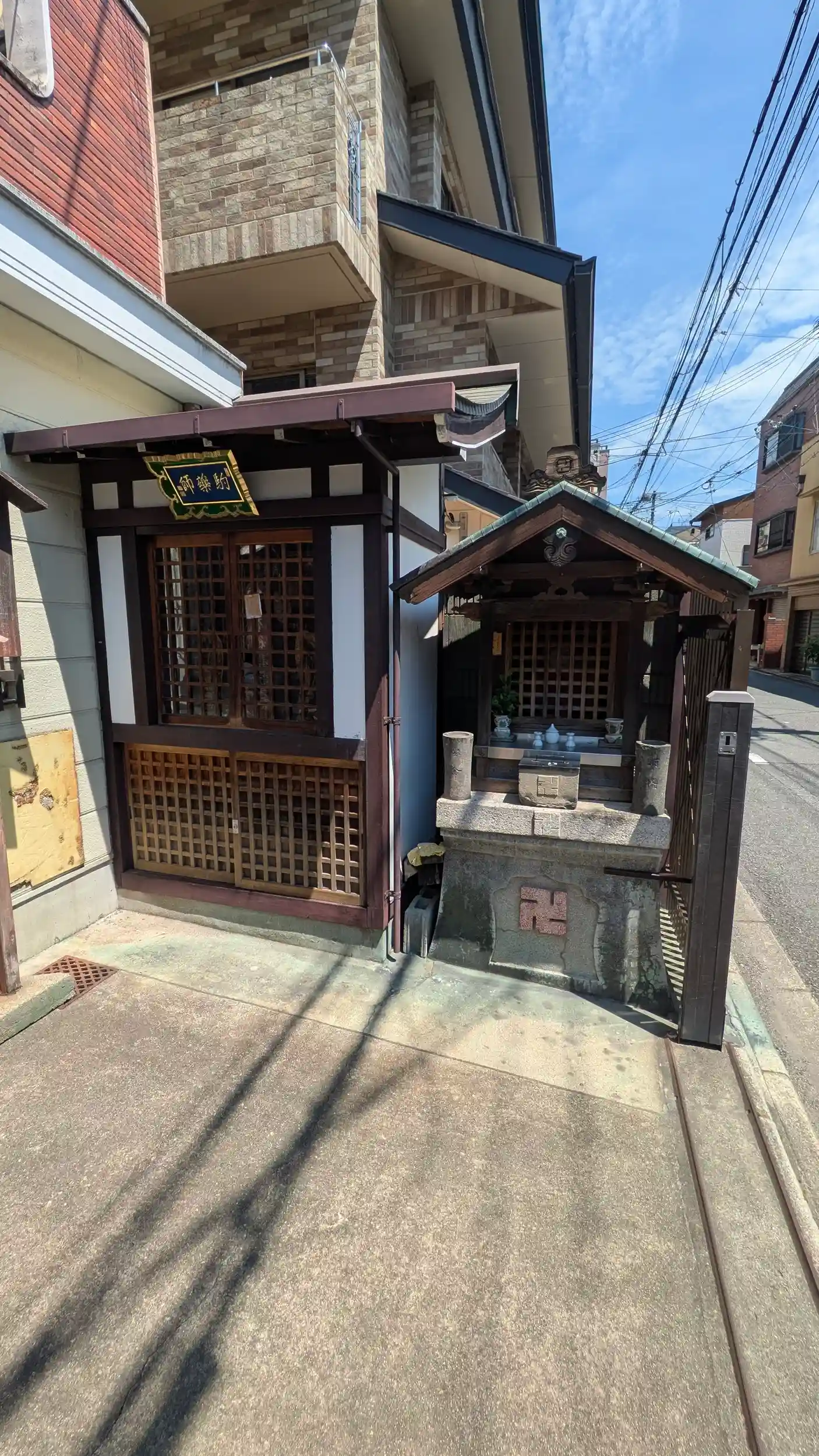 大将軍社から左京区に入り菊鉾町の民家らしき敷地内に「駒薬師如来」の駒札を見つけ、お詣り。薬師堂と地蔵堂が並んで鎮座しておりました。地蔵堂は町中によくある地蔵様なのですが、薬師様がなかなか立派なお薬師さんで前には日光月光両菩薩を従えた薬師三尊で祀られており、ほかにも小さな像が所狭しと並んでおりました。菊鉾町は宝永5年(1708)の大火の後、現在京都御苑がある柳馬場丸太町上ル駒薬師町の町民を移して開町した地域であり、明治までは「駒薬師町」と呼ばれていたようです。この薬師様が町内で祀られていたものなのか廃仏毀釈等で廃寺になったお寺の忘れ形見なのかは由緒やネット検索も見当たらないので想像の域を出ませんが、町中の小さな御堂に置いておくには勿体ないような気がします。