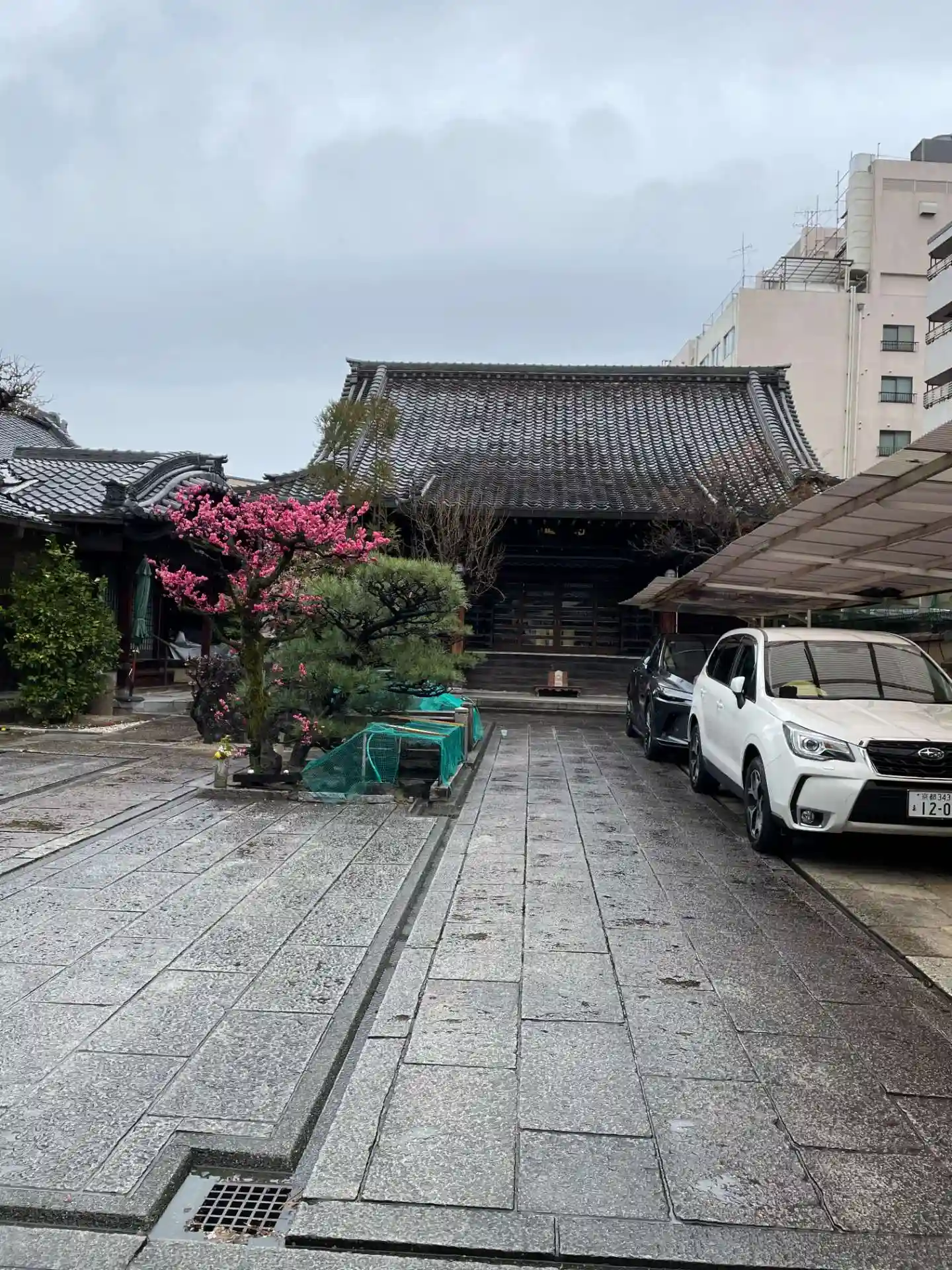門の向こう側境内には車が何台か停めてあります。