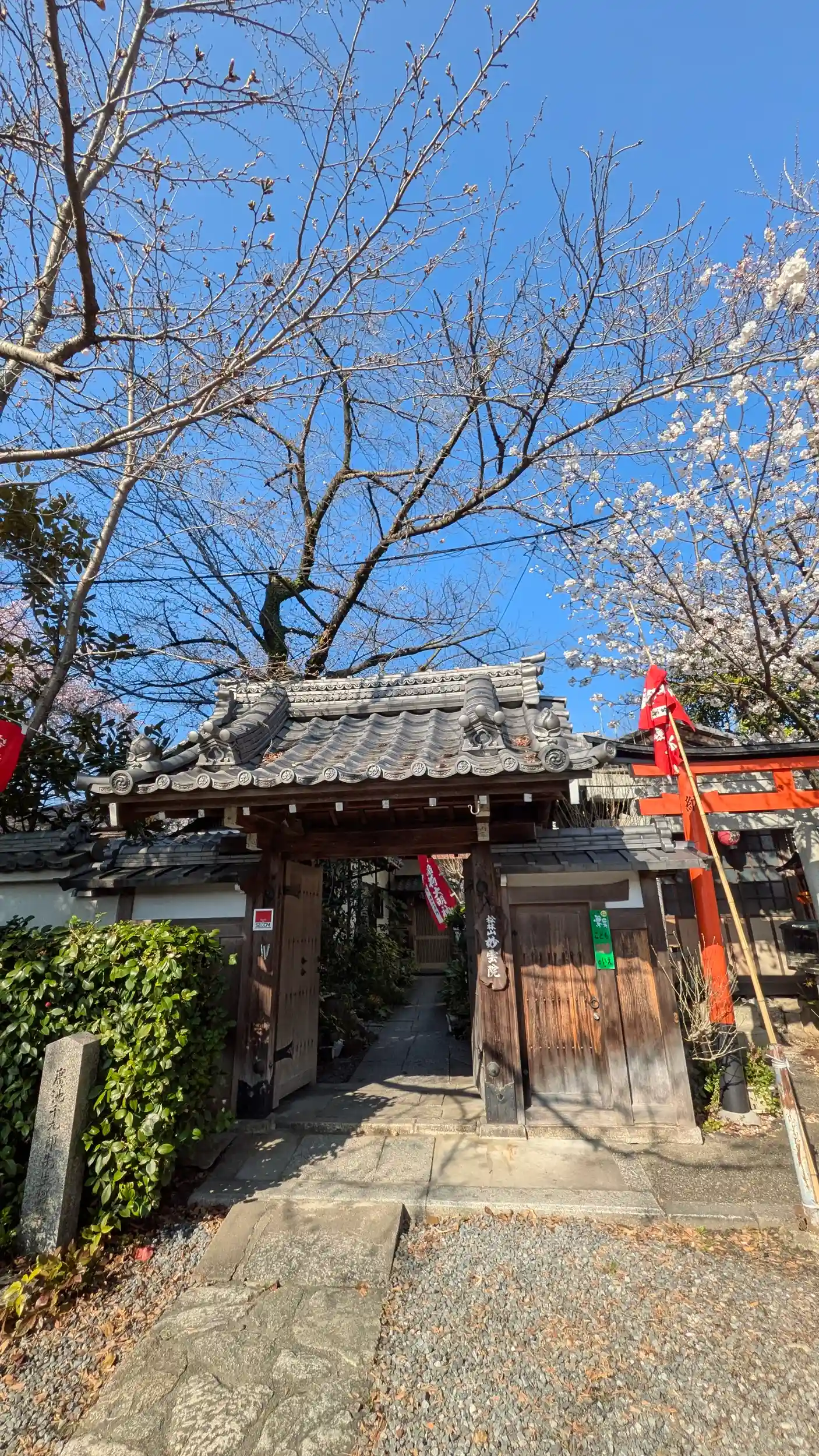 頂妙寺の山門へ向かっていると最上稲荷の桜が😍朱の鳥居と桜のコラボが最高ですね🤗染井吉野にしてはちょっと白いかな?とは思いますがお天気の中良き桜に恵まれました😊お隣妙雲院さんの境内にはこれまたきれいな枝垂れっぽい桜が🤗花をみると寒桜かな?こちらはピーク過ぎた感じでしたが良きでした。桜を見てると黒猫ちゃんが・・・😍もちろん警戒心満々で近寄ってはくれませんが・・・😅