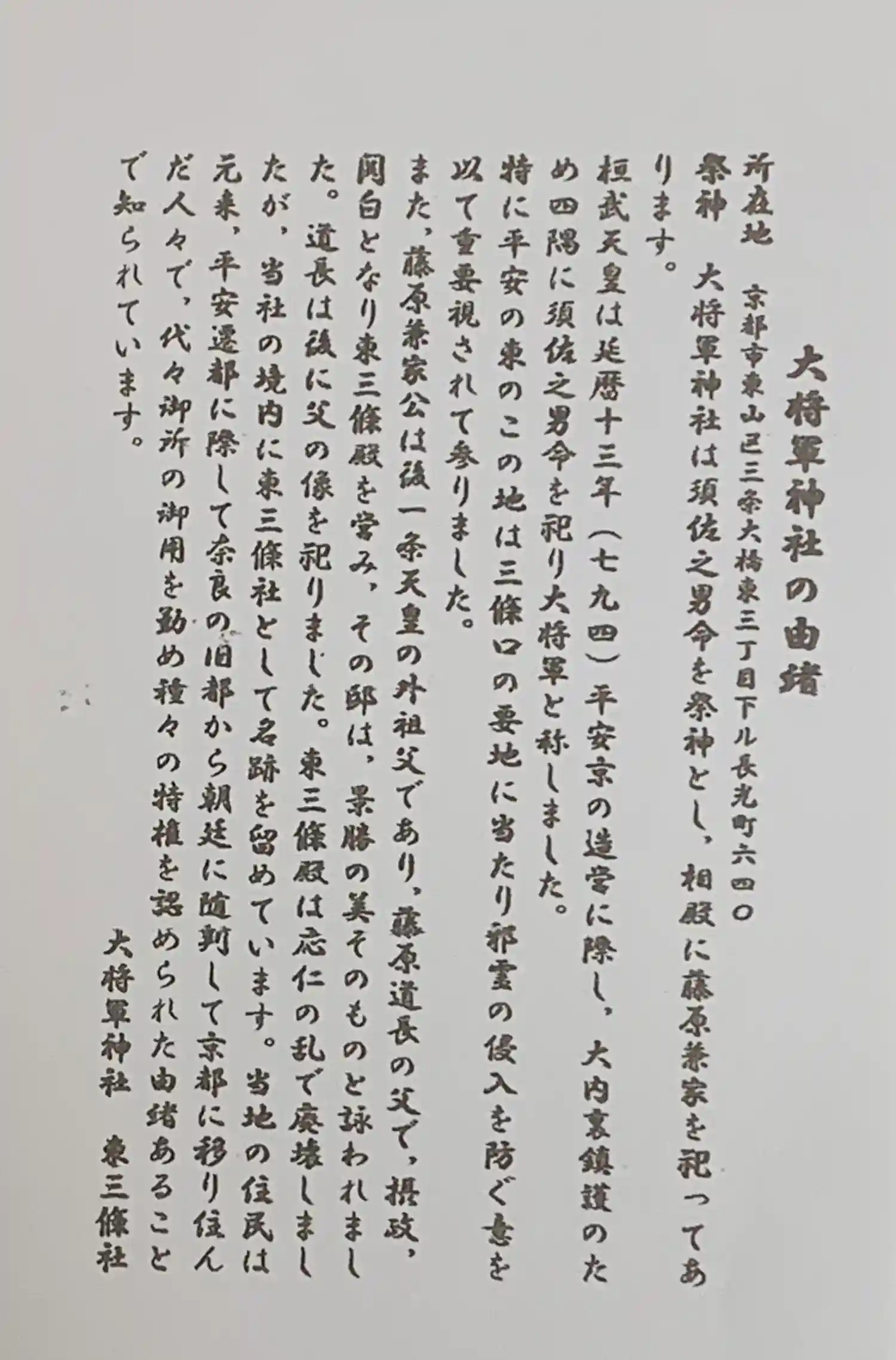 | ご由緒 | 素盞嗚尊を主神として、相殿に関白藤原兼家を祀る。桓武天皇が平安京を造営した際に、大内裏鎮護のために四方四隅に祀られた大将軍神社のうち東南隅の一つである。