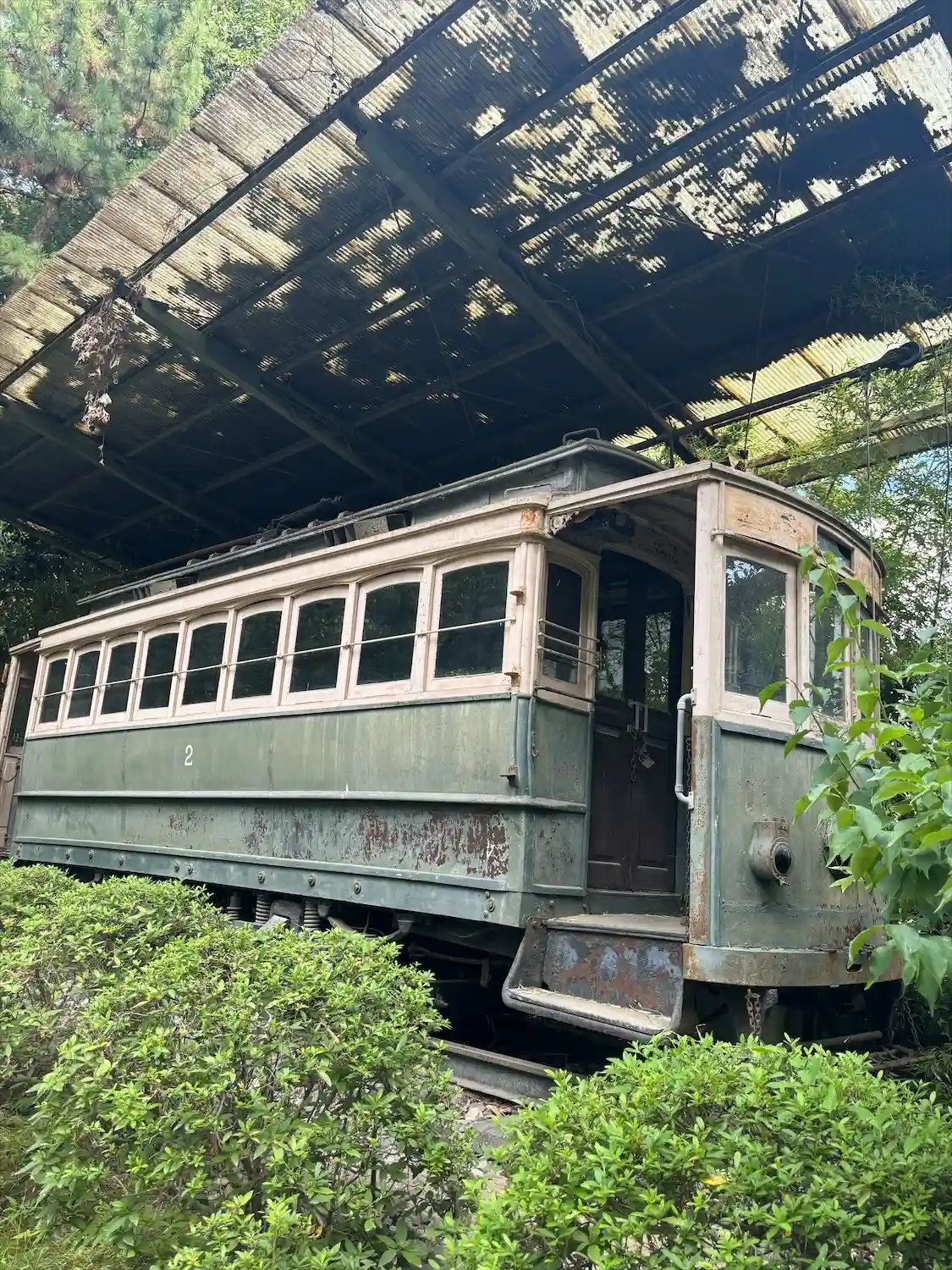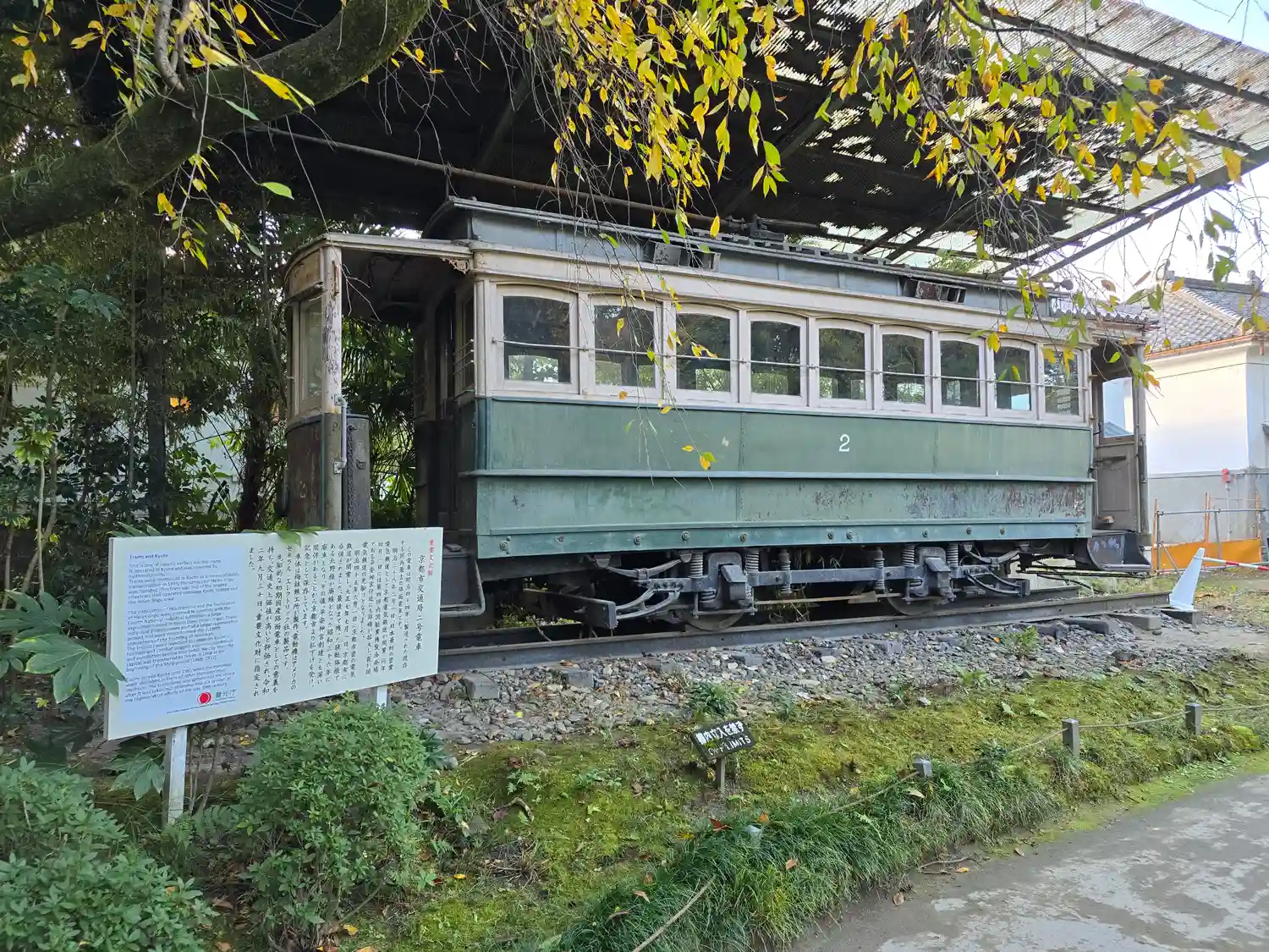 門の左手に静態保存されている京都市電の車両。