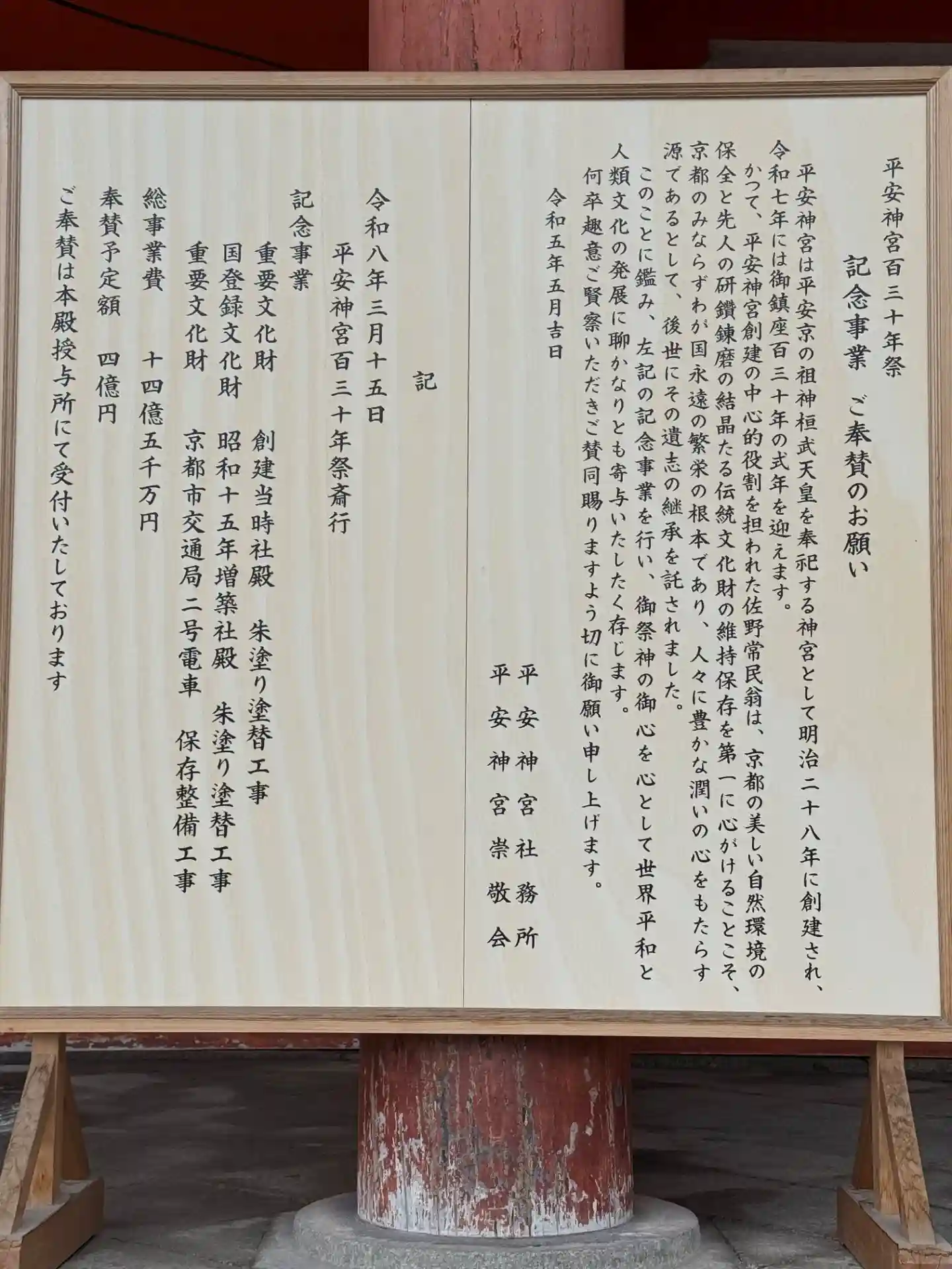 明治二十八年はあたかも平安京が定められ千百年にあたり、京都市民は この記念すべき年に桓武天皇の御偉徳を称え、京都の祖神としてお祀りし ようと平安京の正庁・朝堂院の様式を模して、同年三月十五日平安神宮を 創建いたしました。
