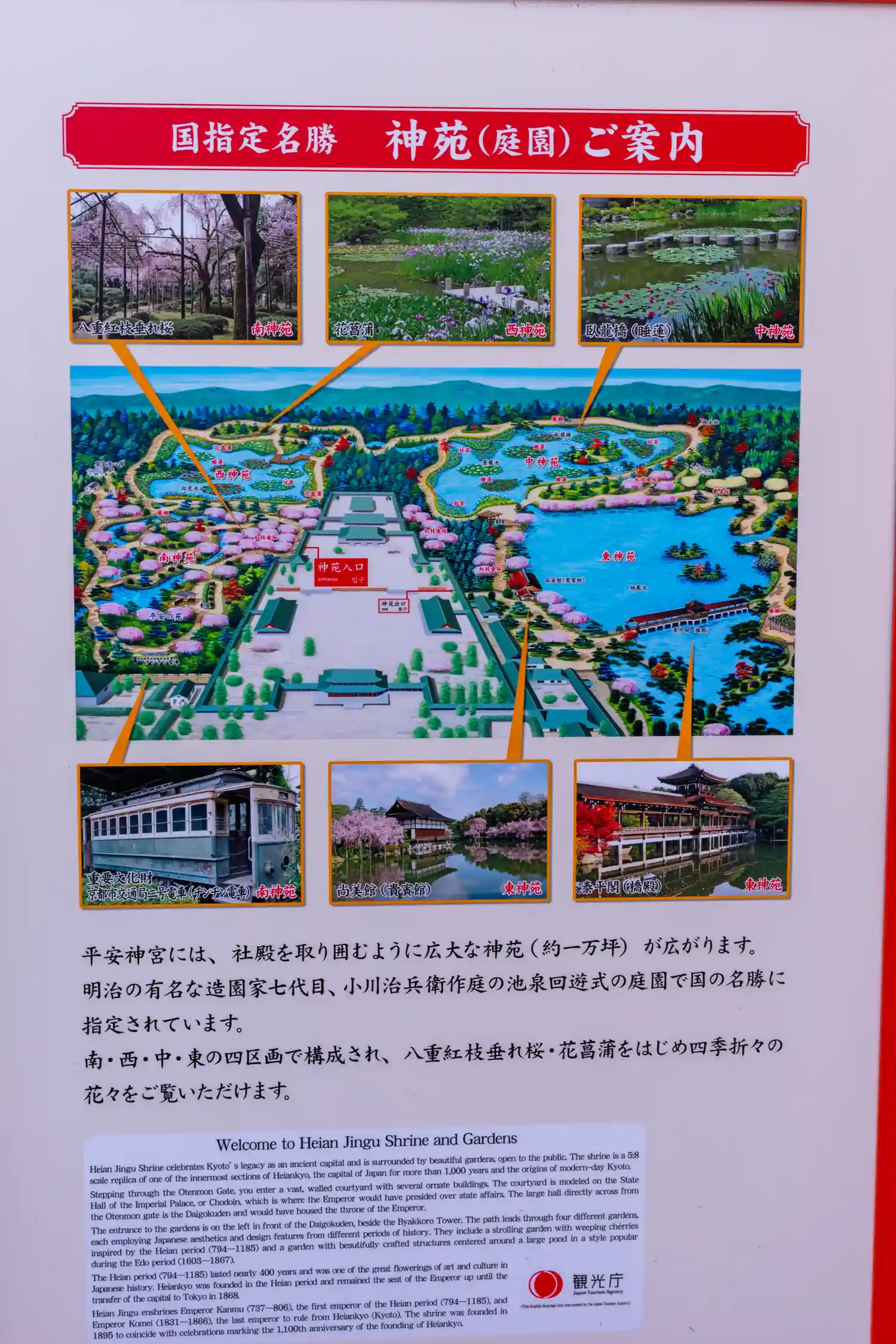 ここにおいて、平安神宮は平安京創始の桓武天皇と最後の 孝明天皇をお祀りし、日本文化の祖神様として、市民は もとより広く国民に崇敬されるようになったのです。