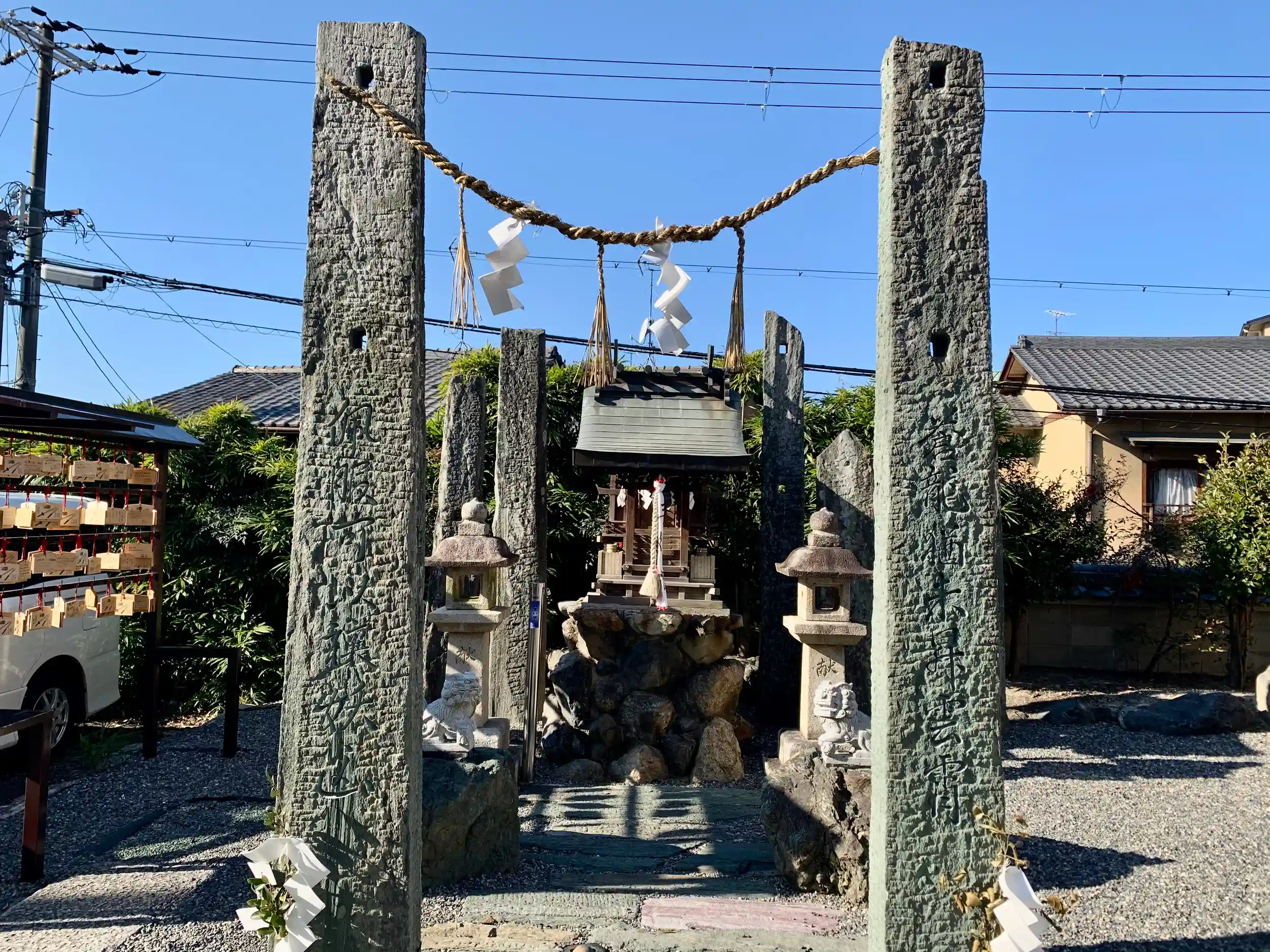 注連縄柱に中央祠。後ろも柱。