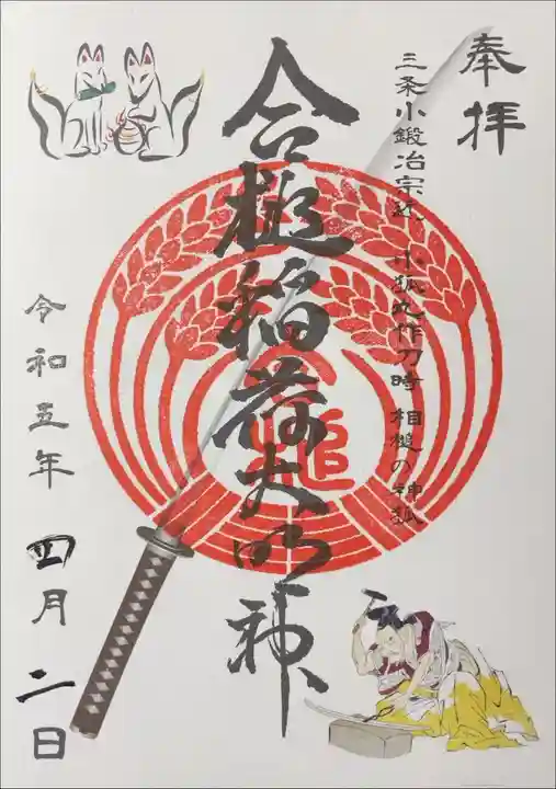 平安時代の刀匠、三条小鍛冶宗近が稲荷大社に祈願し、狐とともに宝剣小狐丸を打ちあげたという逸話が小鍛冶として能や歌舞伎の演目に残されているそうです。
