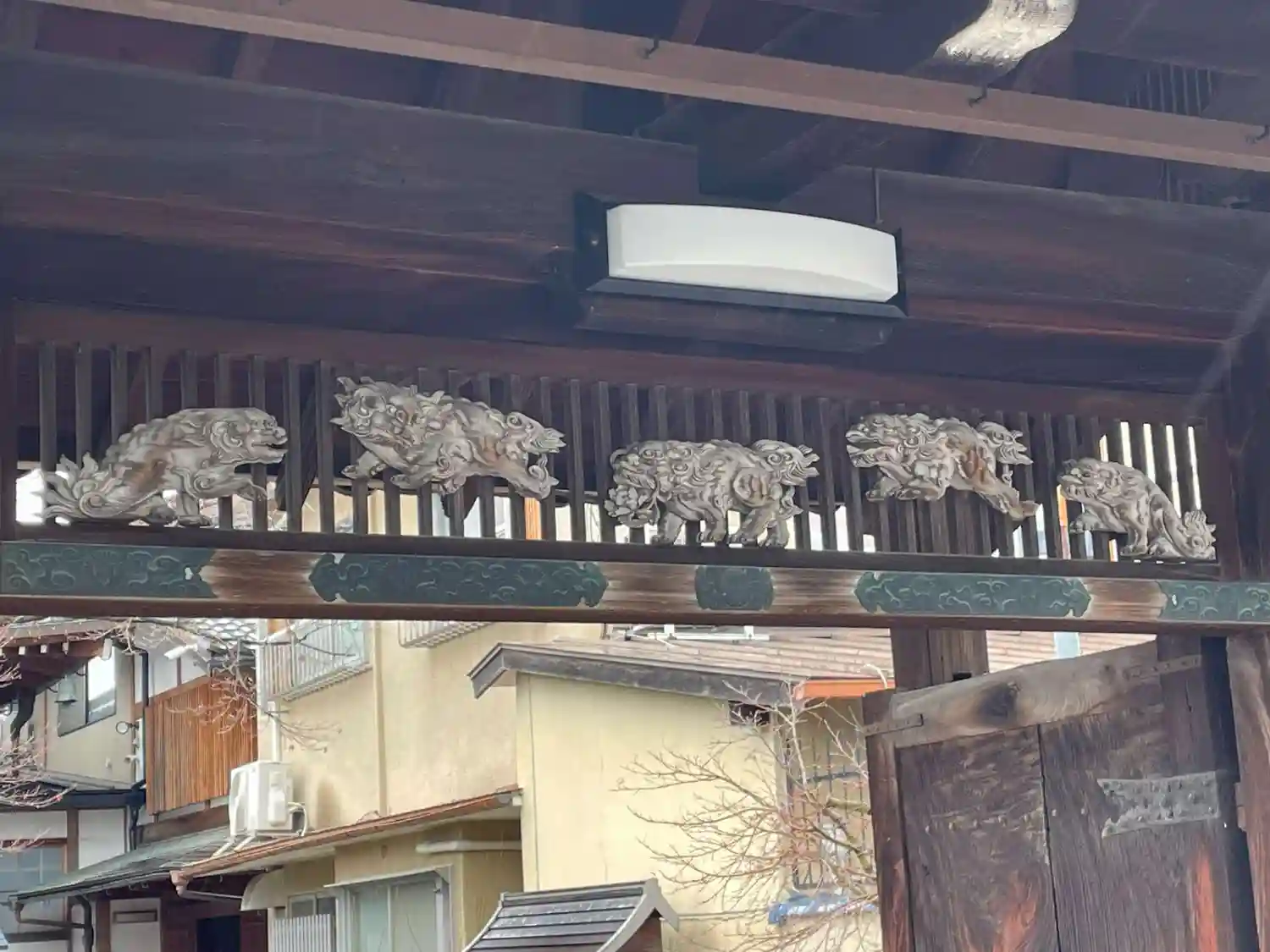 山門の欄干の獅子の彫刻。