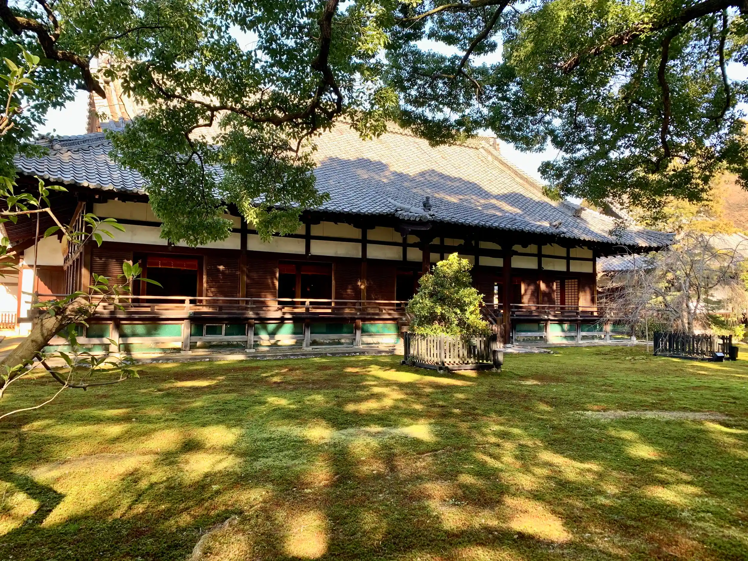 お庭、池、日吉社、本堂(工事中)、と進み宸殿前の広い庭にでかい楠に鐘楼を見て、宸殿奥の出口から外に出る。