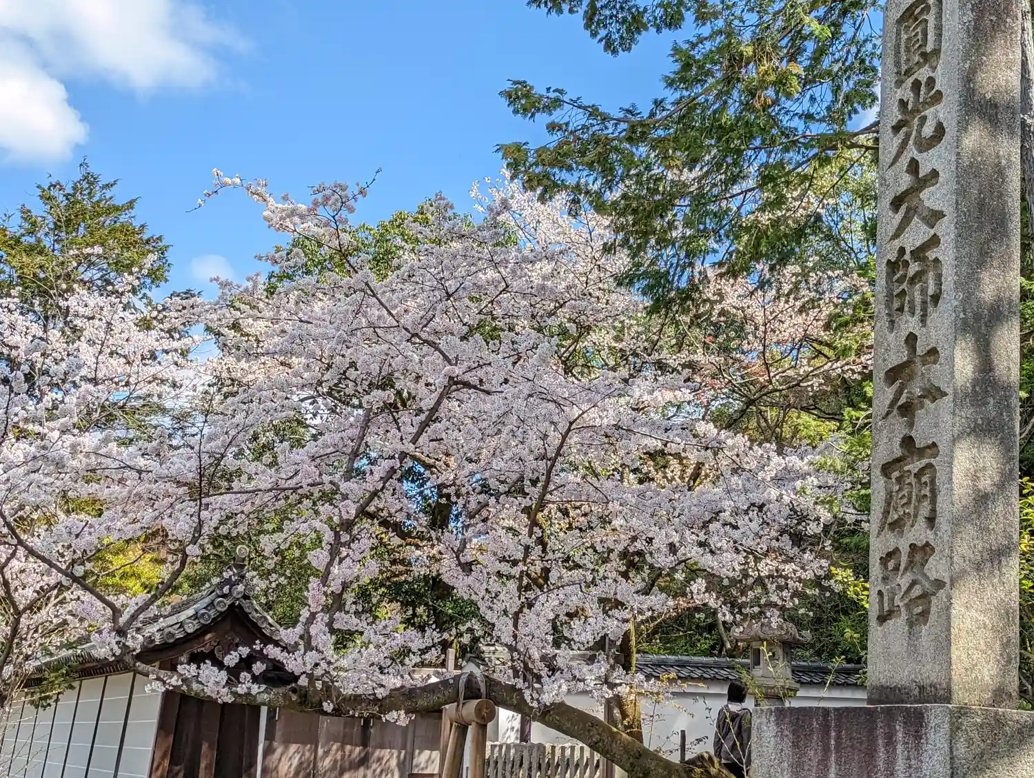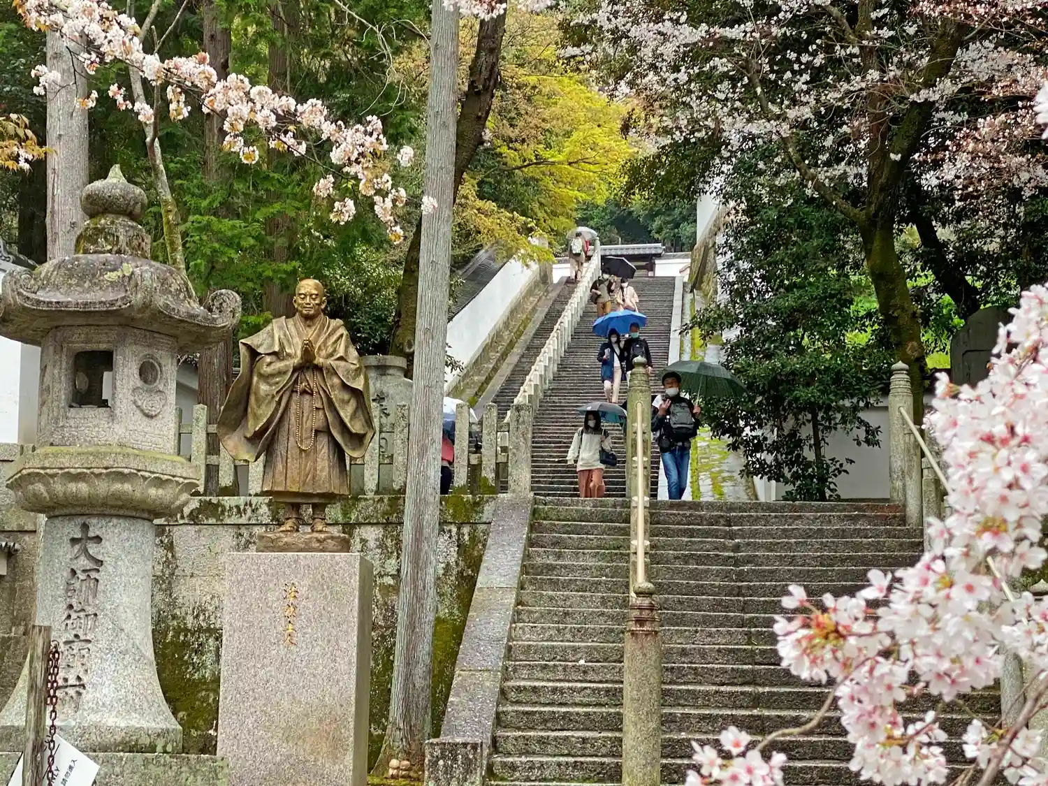 後から分かったことには、こちらは上段の境内に向かう階段。大雨に気持ちが萎え、この先には向かわずじまい。桜の合間に<法然上人像>が見える。