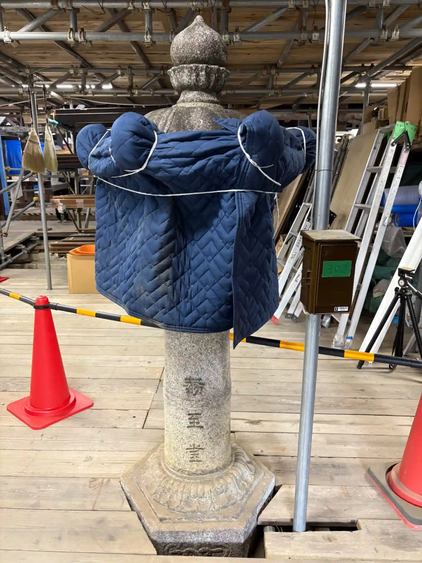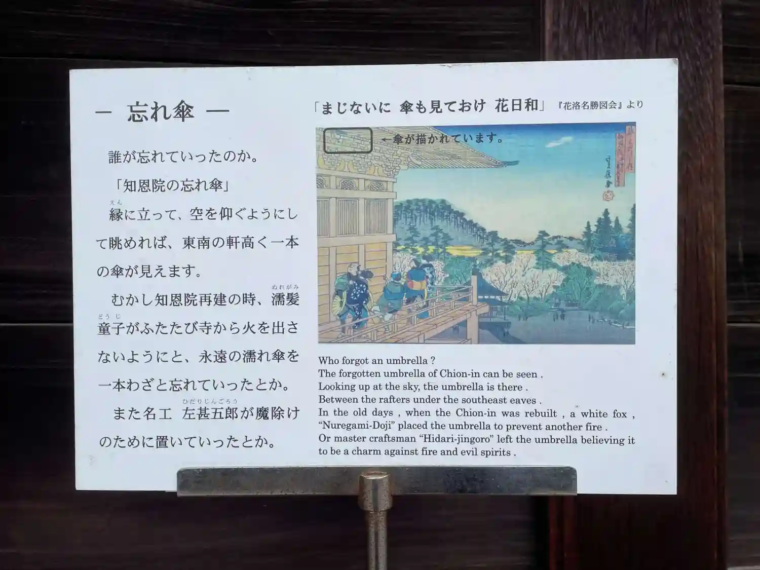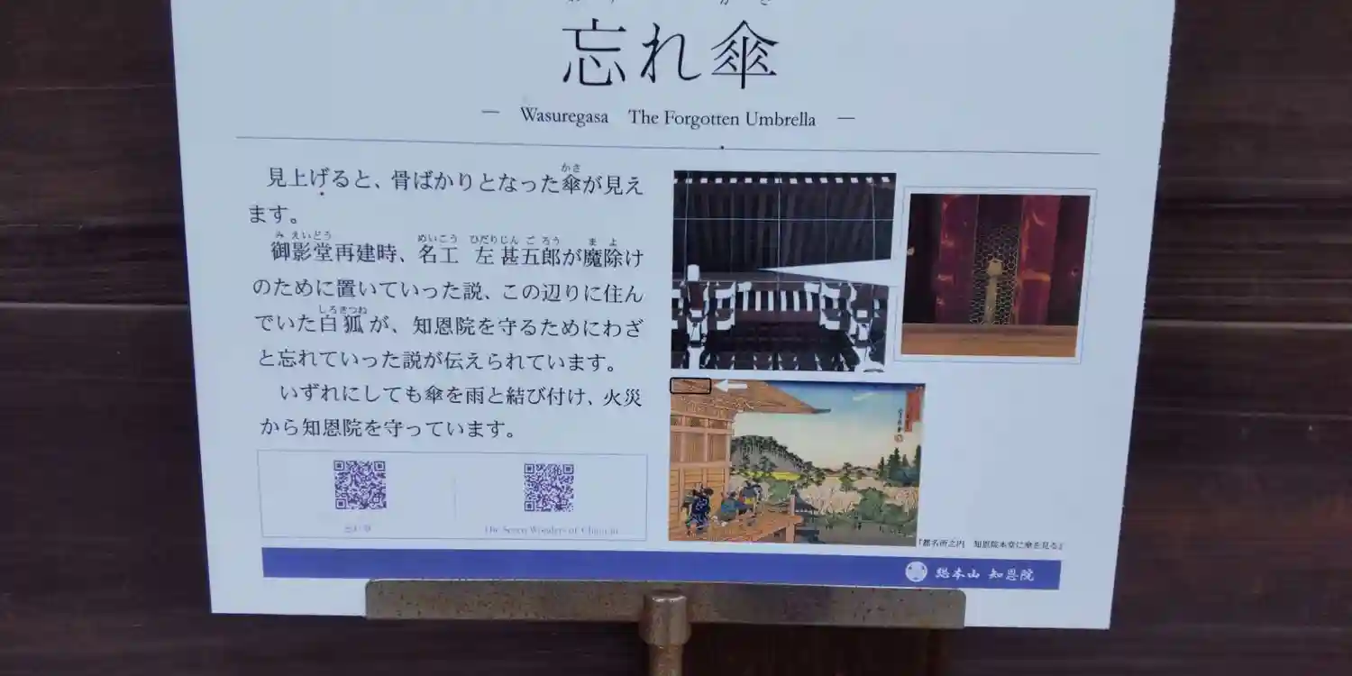 七不思議のひとつ 忘れ傘 御影堂正面軒下に名工・左甚五郎が魔除けに置いたとも、白狐の化身・濡髪童子がおいたとも伝えられる傘で、知恩院を火災から守るものとされている