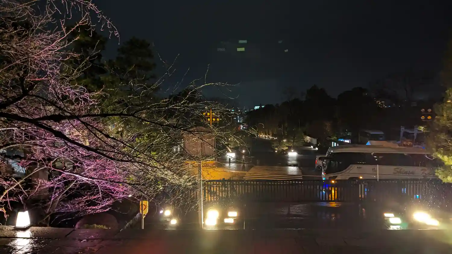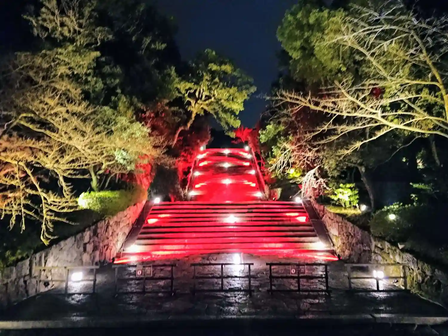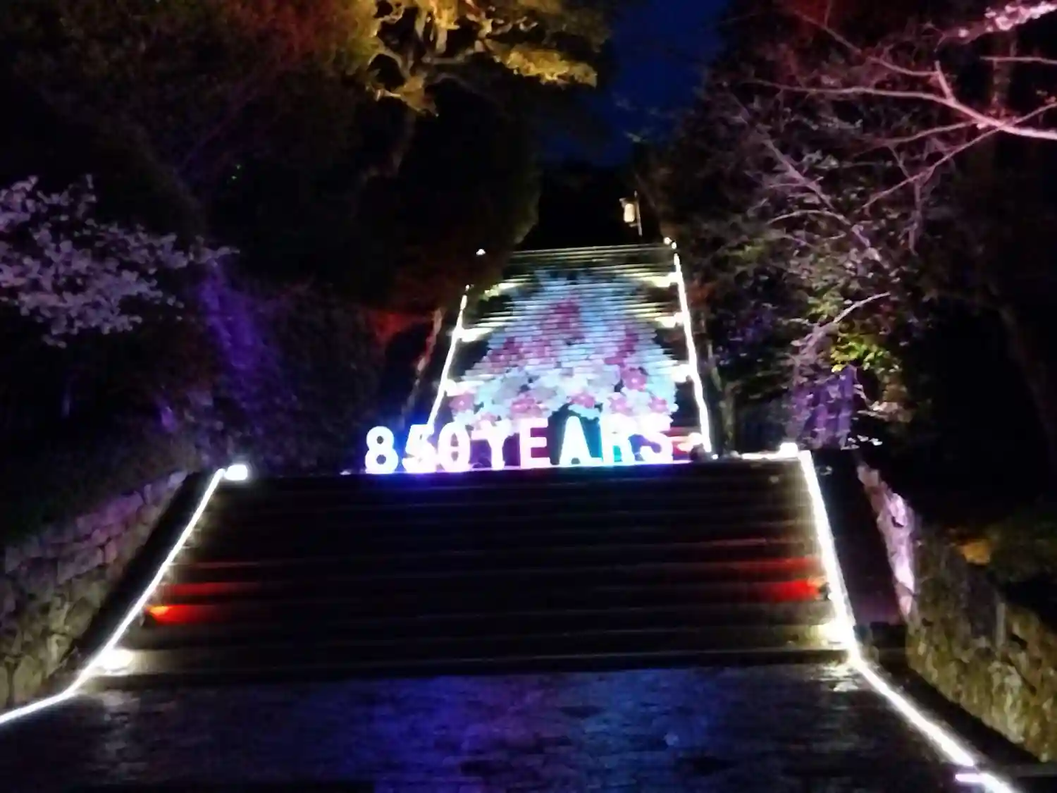 男坂のライトアップ。白、赤、青と3色に色が変わりました。