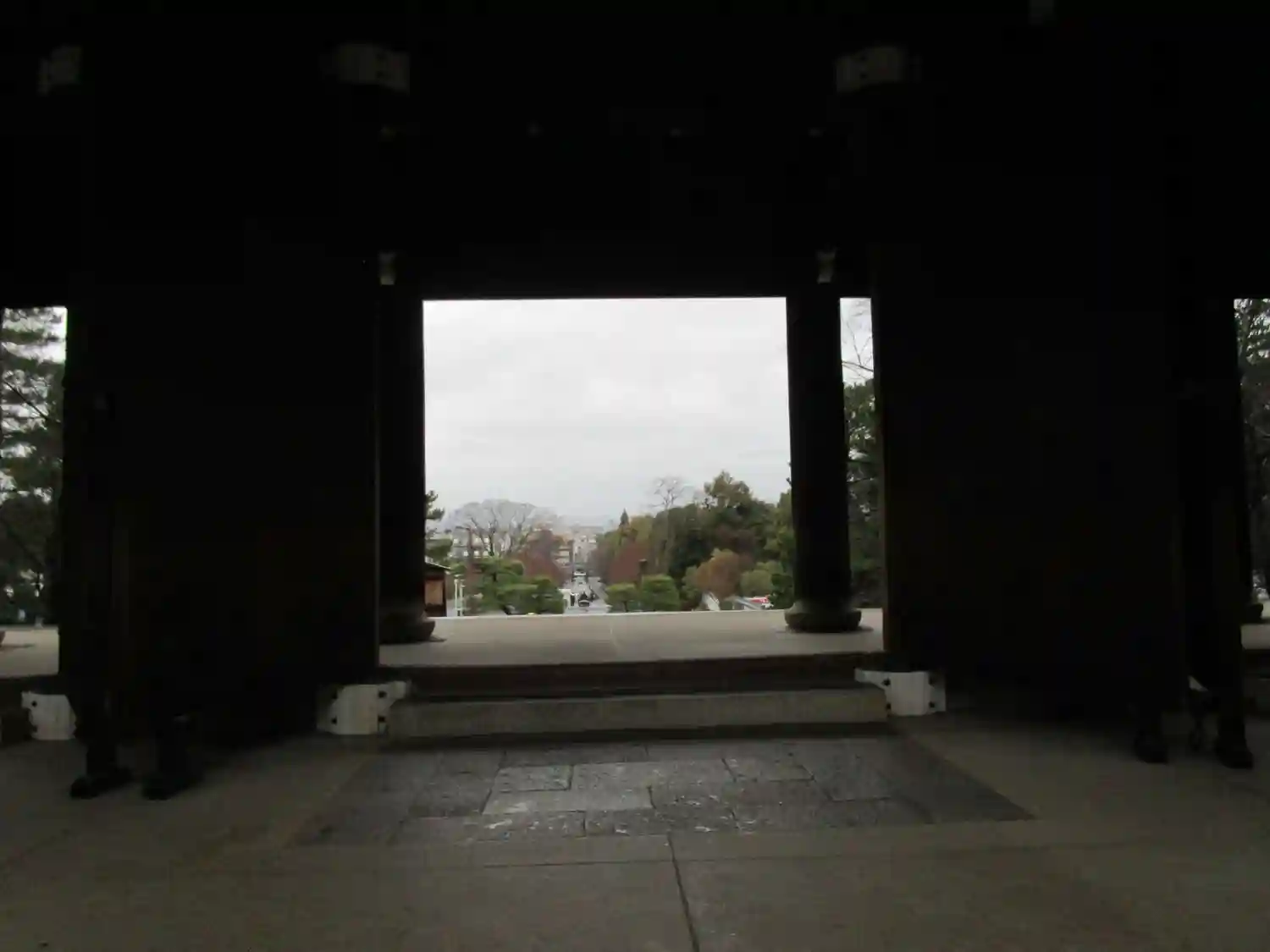 お参り終わって本殿側から山門を眺める。