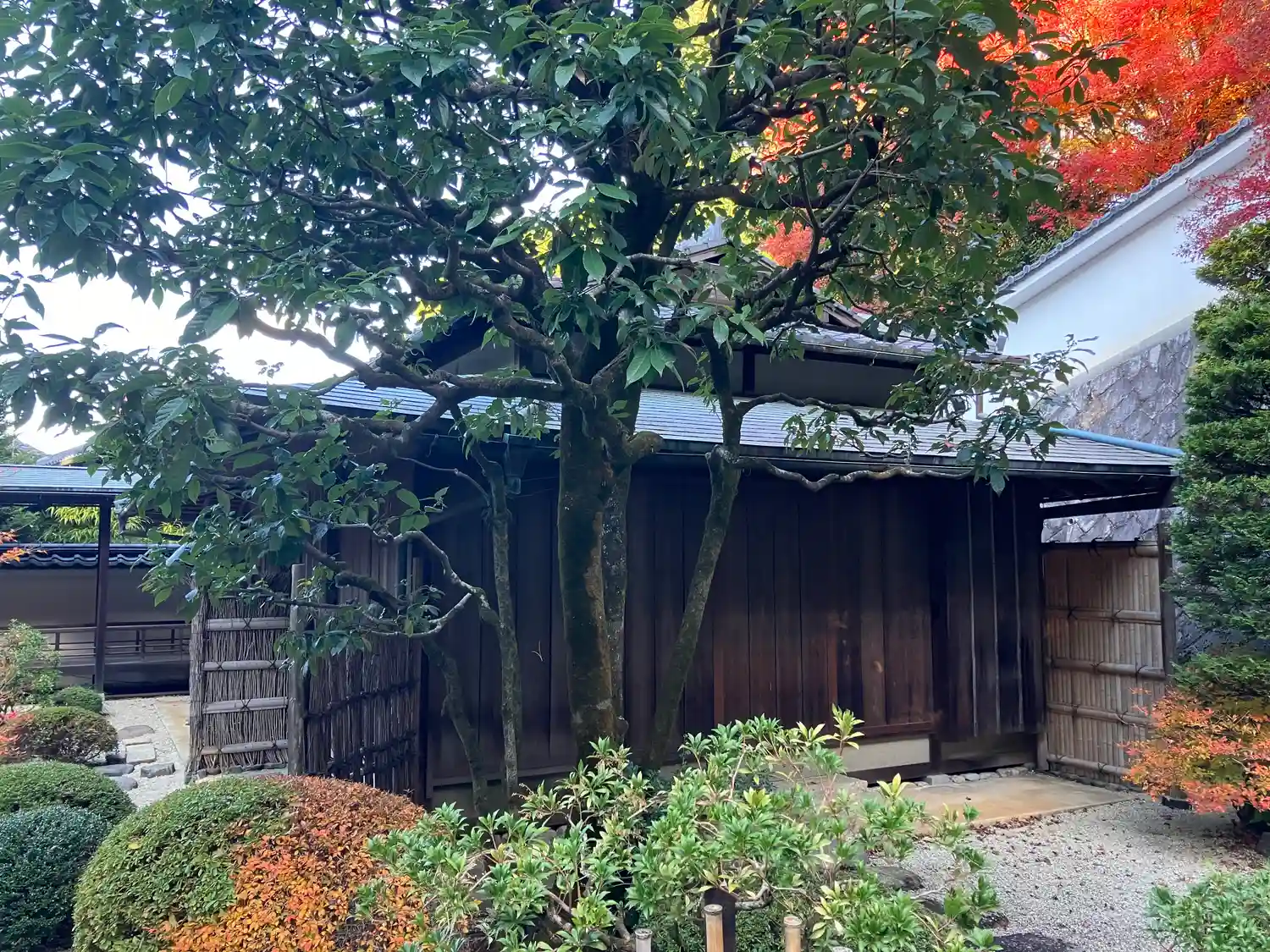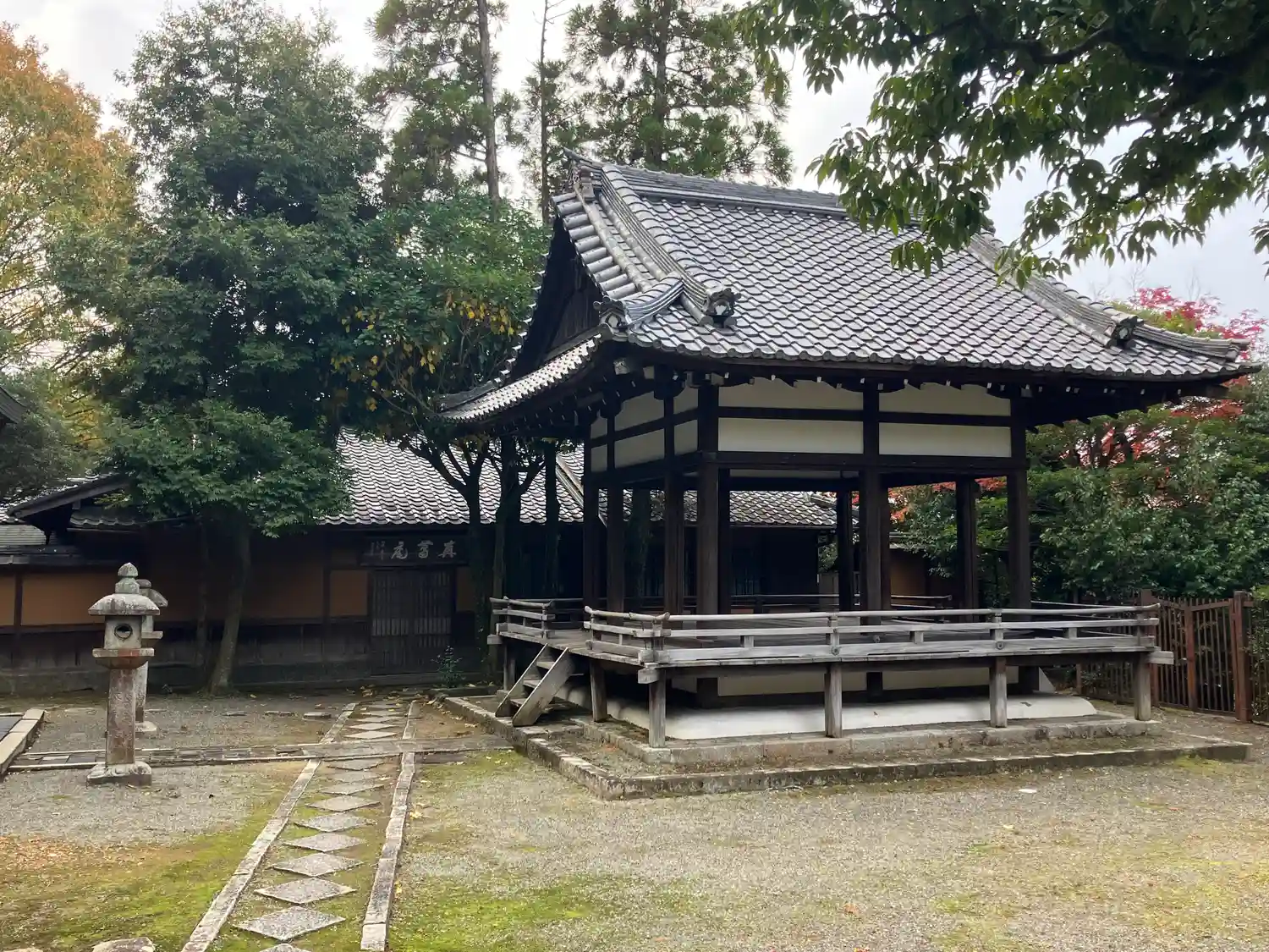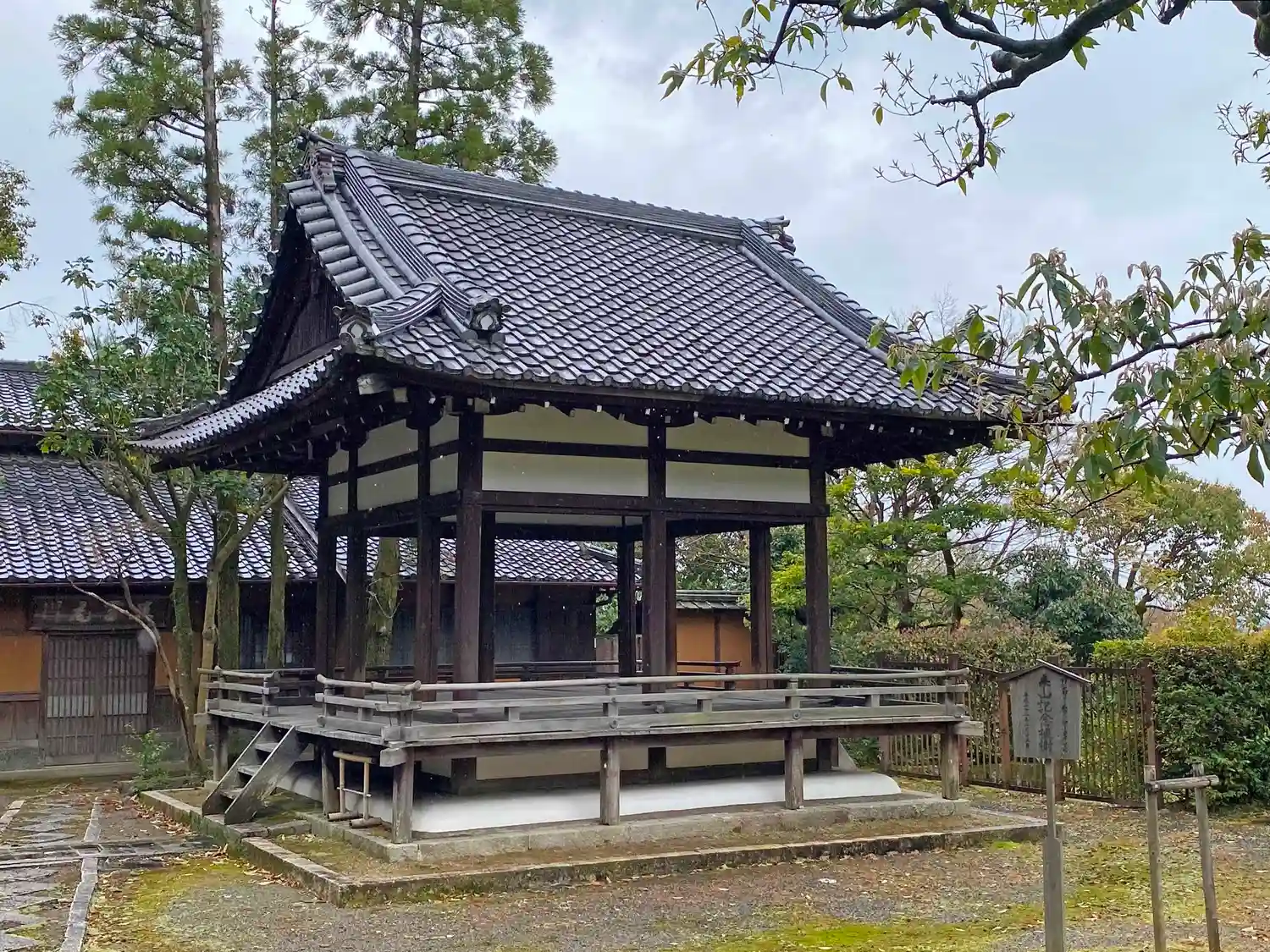 こちらは<鎮守八幡社>の社殿前に建つ<舞殿>。奥の建物は茶室<真葛庵>で、毎月3日に裏千家の月釜が開かれるとか。