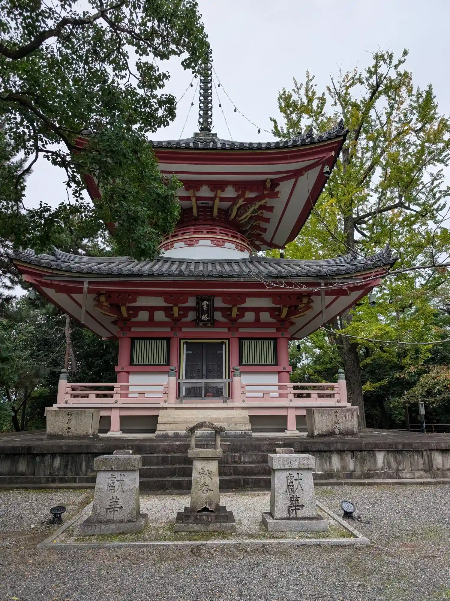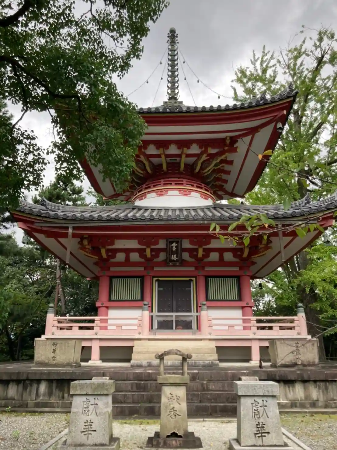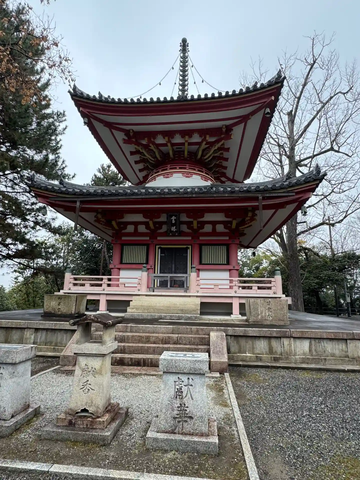 まずは境内西側から。鮮やかな朱色が目立つ<霊塔>。