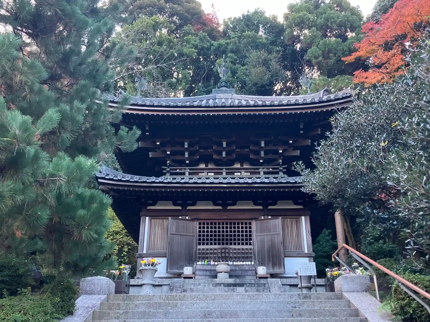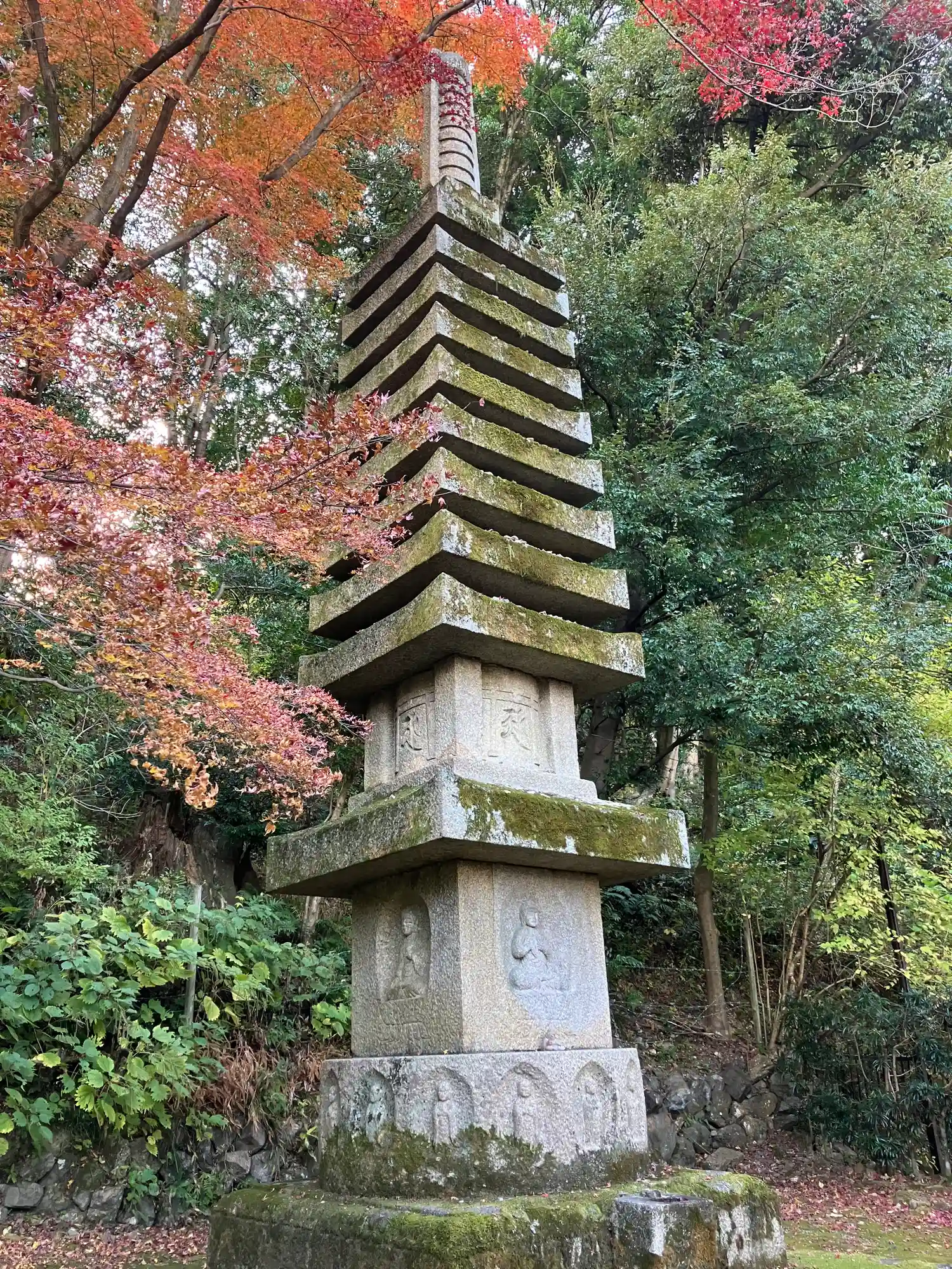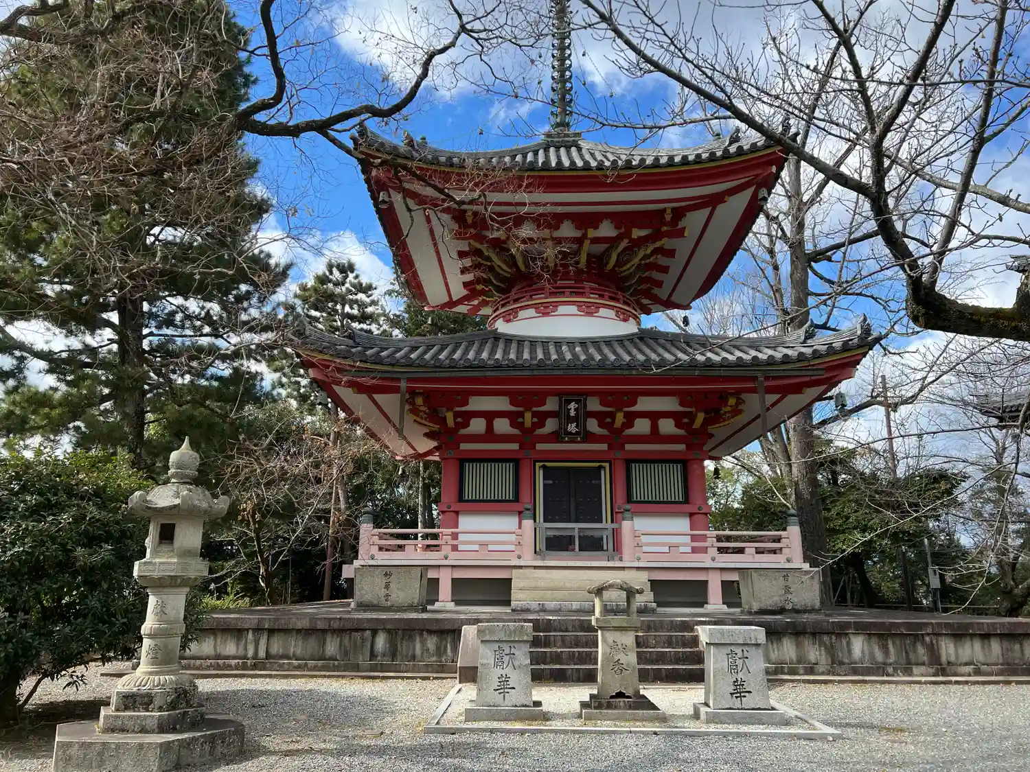 まずは境内西側から。鮮やかな朱色が目立つ<霊塔>。