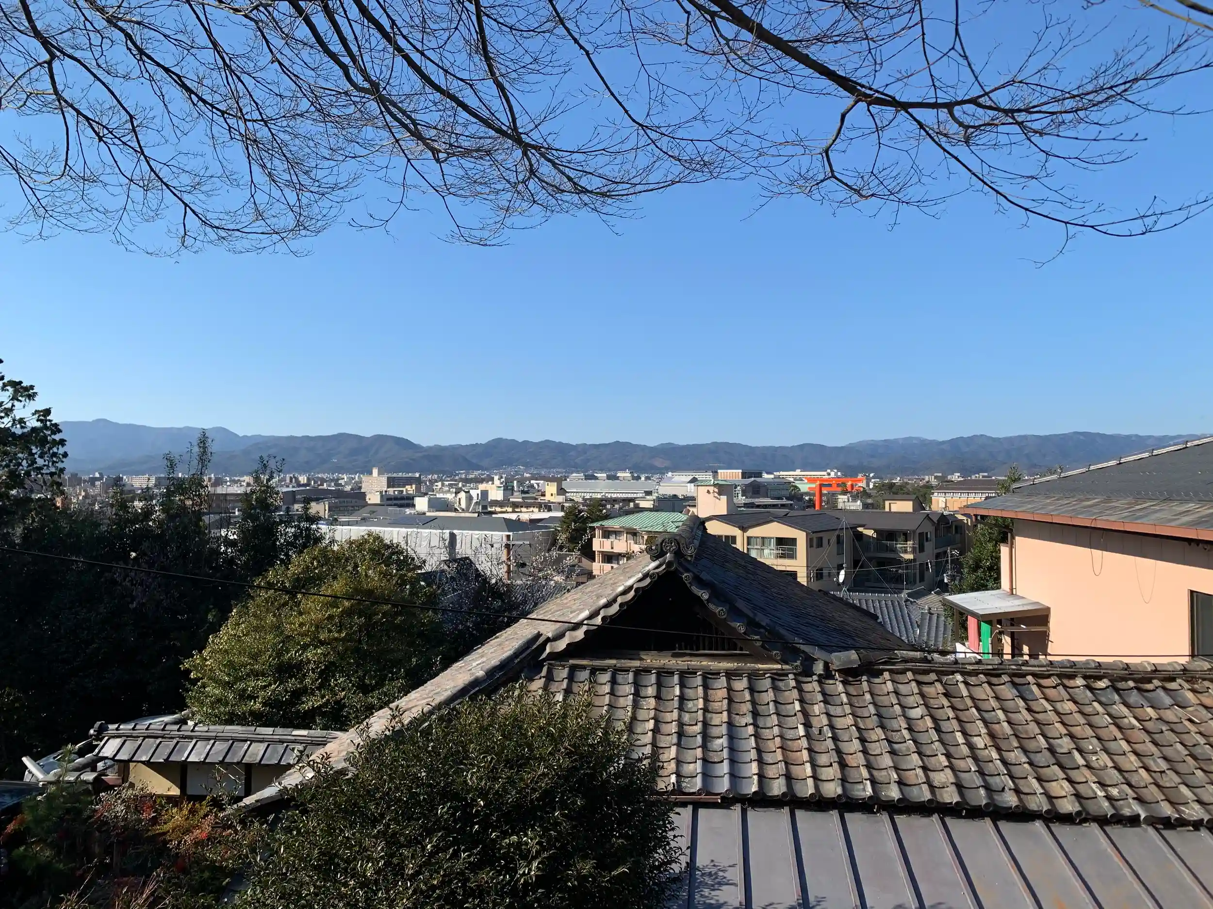 山に面しているような境内で、平安神宮の大鳥居が見える。