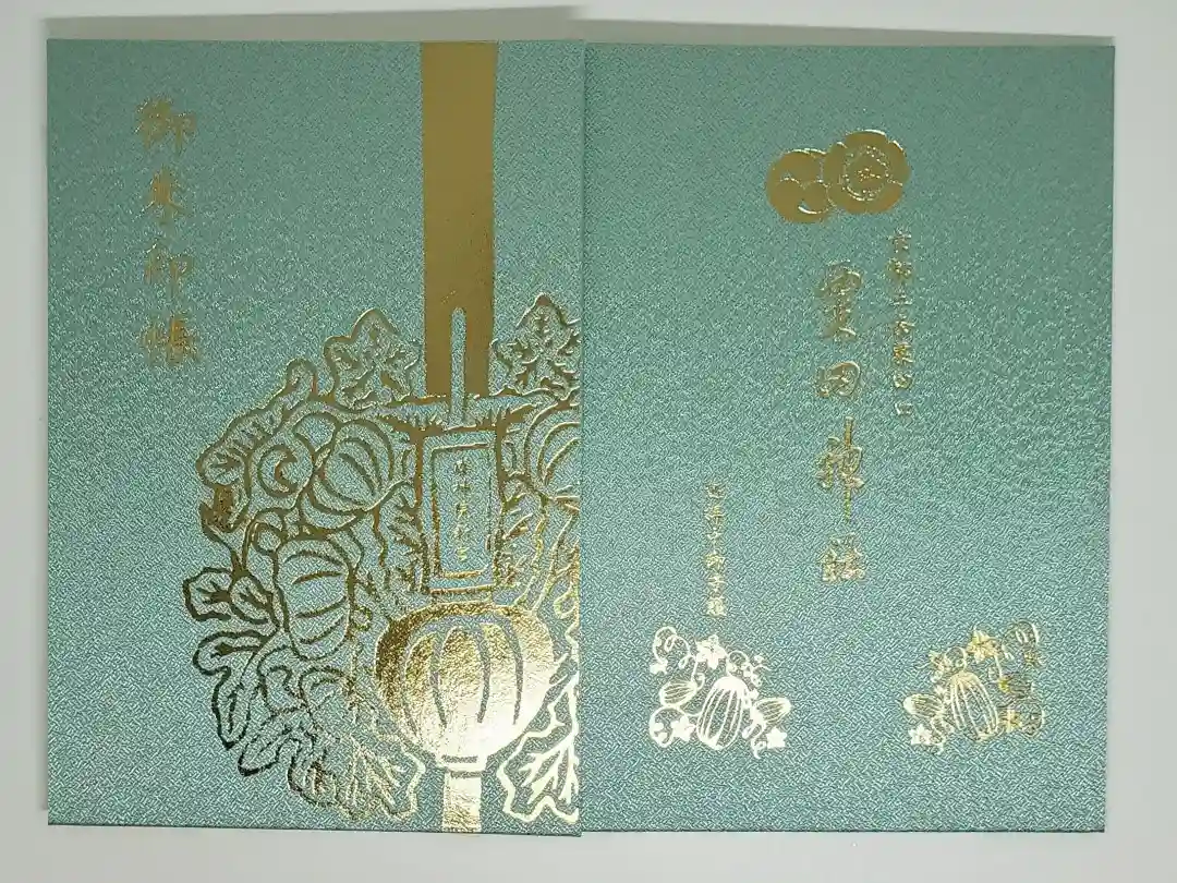 表面に「御朱印帳」の文字と御神宝の阿古陀鉾の図柄が、裏面に御神紋と「京都三条粟田口 粟田神社」「巡拝中御守護」の文字、阿古陀瓜(アコダウリ)が金色で箔押しされています。