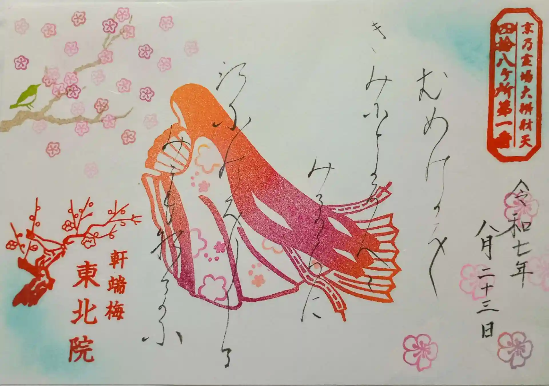 和泉式部が東北院に「軒端の梅」を植えたがその梅とされるものが現在も境内にあり、実際に歴史を感じさせる高樹齢で枯れかけている幹と新しい幹がはえたりしている梅の木を拝見。御朱印は、和泉式部と巳年限定の宇賀神の御朱印をいただきました。いっしょに和泉式部の家系図もいただきました。歴史を感じることのできる寺院でとても充実したお参りでした(^_^)