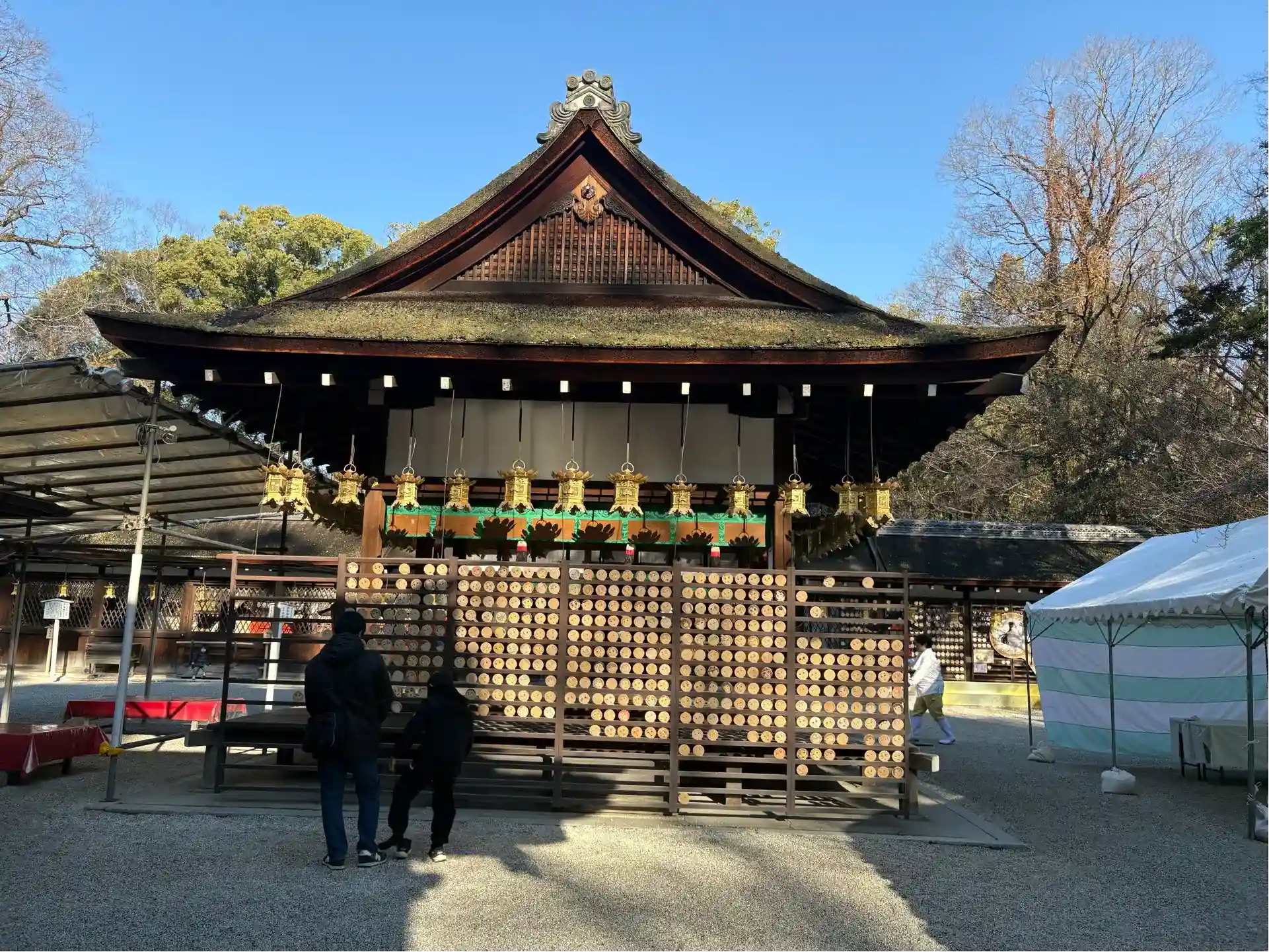 京都旅行2日目は北西部を攻めてみました。まず下鴨神社を目指しましたが、境内に入ってすぐの摂社の河合神社を参拝。美麗の神、女性守護の神である玉依姫命を御祭神としており、美麗を祈願する鏡絵馬が有名とのことです。孫娘達が美人になる様にお祈りしました。